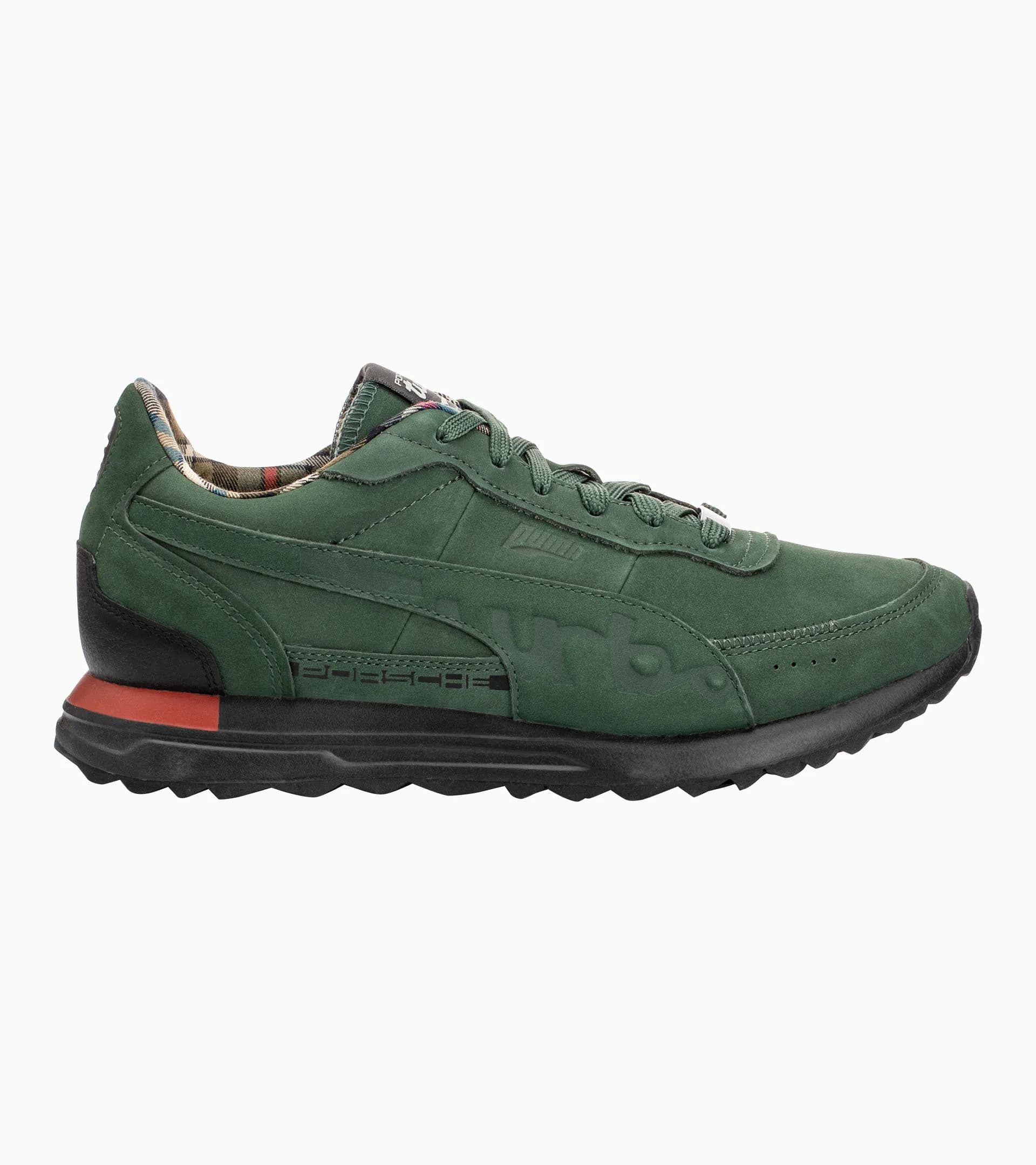 Perfekt für alle, die ein Stück Porsche Geschichte am Fuß tragen wollen: der 50Y 911 Turbo Sneaker "Turbo 930" feiert mit ikonischem Innenfutter – inspiriert vom legendären „Mackenzie“-Tartanmuster der Sitze eines Turbo der ersten Generation – das 50-jährige Jubiläum des Porsche 911 Turbo. Das Nubukleder ist angelehnt an die Exterieurfarbe Grün Metallic und strahlt sportliche Eleganz aus während der Porsche Schriftzug, der als Beklebung für den Sportwagen bestellbar war, den Schuh zum wahren Eyecatcher macht. Ein besonderes Highlight: der Turbo-Schriftzug auf dem Formstrip. Die Prägung verleiht dem Sneaker das gewisse Etwas. An der Ferse erinnert das rote Element an die durchgehende Bremsleuchte des Sportwagens. Eine abnehmbare Plakette mit dem 50Y Anniversary Print und zusätzliche Schnürsenkel unterstreichen den luxuriösen Charakter des Schuhs. Ein raffiniertes Detail ist das Porsche Wappen an der Ferse, das an die legendäre Fuchsfelge erinnert, die für die erste Turbo-Generation bestellbar war. Die Innensohle zeigt die markante Silhouette des ersten Porsche 911 Turbo – eine Hommage an die Anfänge dieser Legende. Abgerundet wird das Design von einer Schuhtasche, inspiriert vom Look eines Schuhkartons, mit Reißverschluss und zweifarbigem, verstellbarem Tragegurt. Limitiert auf 911 Stück.