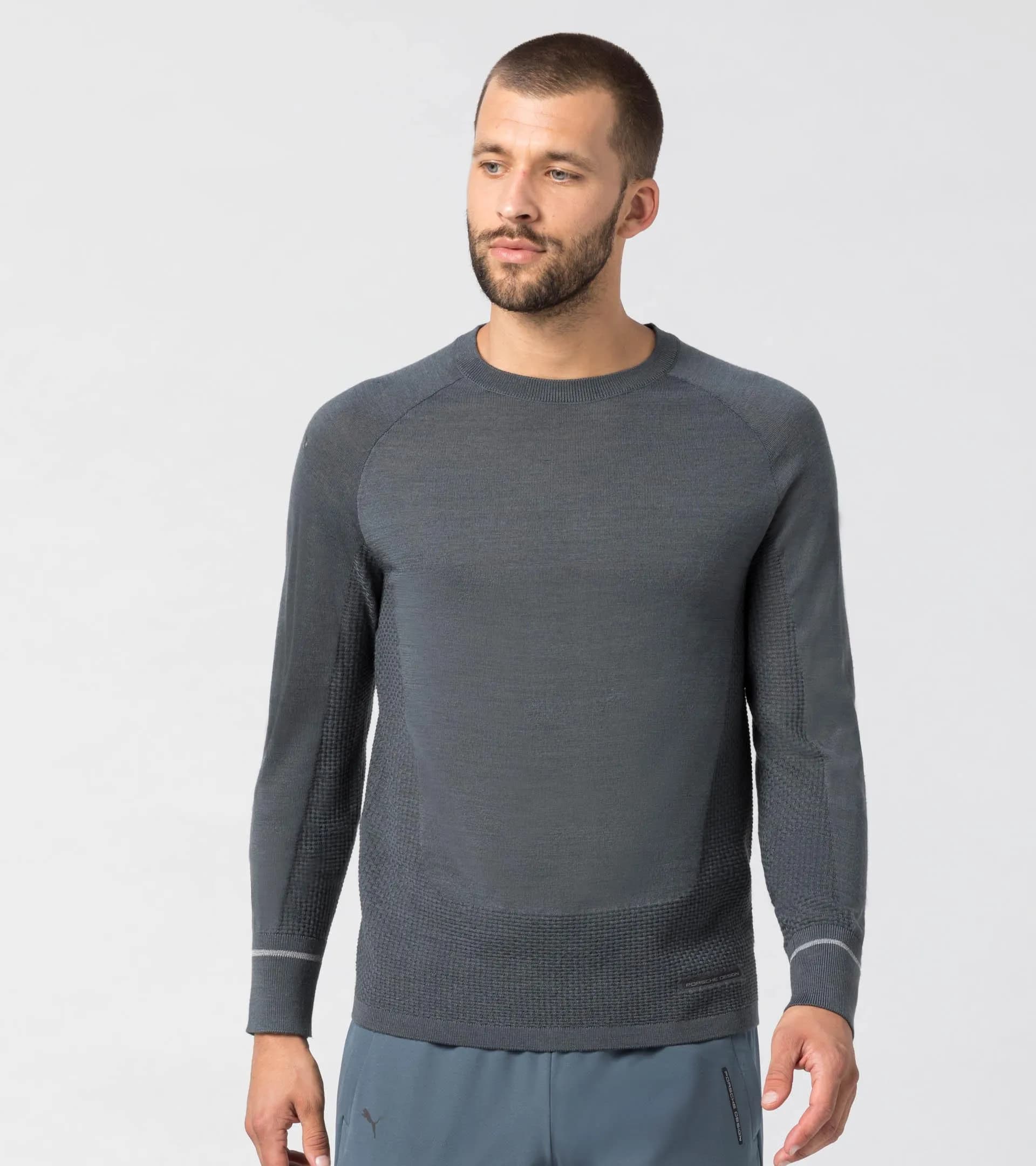 Das technische Upgrade des klassischen Pullovers: Der Porsche Design evoKNIT® Crew Neck aus High-Performance-Strick hebt den Herrenmode-Evergreen Rundhalspullover auf ein neues Level. Die neue evoKNIT®-Technologie bringt wärmende Merinowolle und atmungsaktive, feuchtigkeitsregulierende Belüftungszonen in Mesh-Struktur fast nahtlos zusammen. So bietet der Pullover neben maximaler Bewegungsfreiheit und einer einzigartigen Designästhetik auch ein warmes, angenehm trockenes Tragegefühl für alle Tage. In den Ärmelbündchen eingestrickte Streifen aus reflektierendem Garn verleihen ihm, zusammen mit der nahtlosen Konstruktion und der dynamischen Linienführung, einen ganz eigenen, exklusiv-sportlichen Charakter. Wenn Pullover, dann so.
