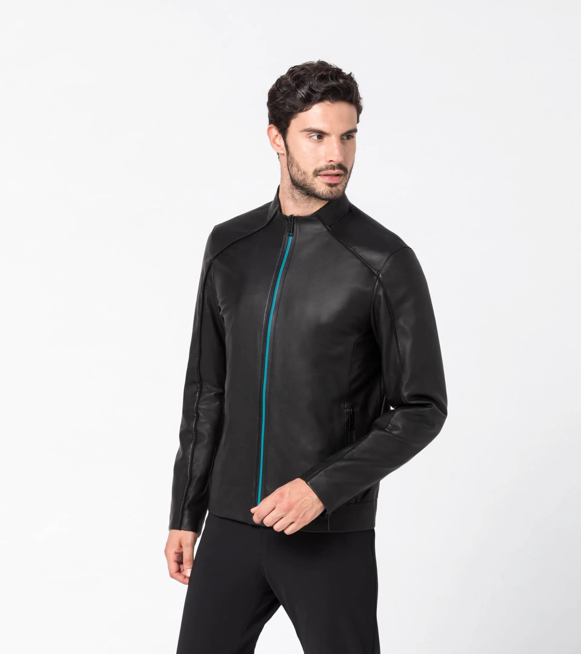 Reduziert und elektrisierend zugleich: Die superdünne Porsche Design Functional Leather Jacket vereint einen geraden, körpernahen Schnitt aus wasserabweisendem Leder mit einem aufregenden Design. Ein getapter, zweifarbiger Front-Reißverschluss in leuchtendem Ocean Depth – der Farbe der Saison – macht die weiche Lammlederjacke zum Eyecatcher. Das von Sportswear inspirierte Taping, an den Reißverschlusstaschen in Schwarz ausgeführt, und der angeschnittene Stehkragen verleihen der All Day-Jacke einen sehr modernen, technischen Look. Reißverschlüsse am Ärmel und eingeprägte Streifendetails am Oberarm, setzen dezente, aber dynamische Akzente. Für das exklusive Finish sorgen der im Kragensteg eingeprägte Porsche Design Schriftzug und das Porsche Design Jacquard-Futter. Perfekt zur Geltung kommt der einzigartige Charakter der Functional Leather Jacket in Kombination mit dem PD-Icon Chequered Flag Sweater, Travel Pants und dem City Sneaker Leather.