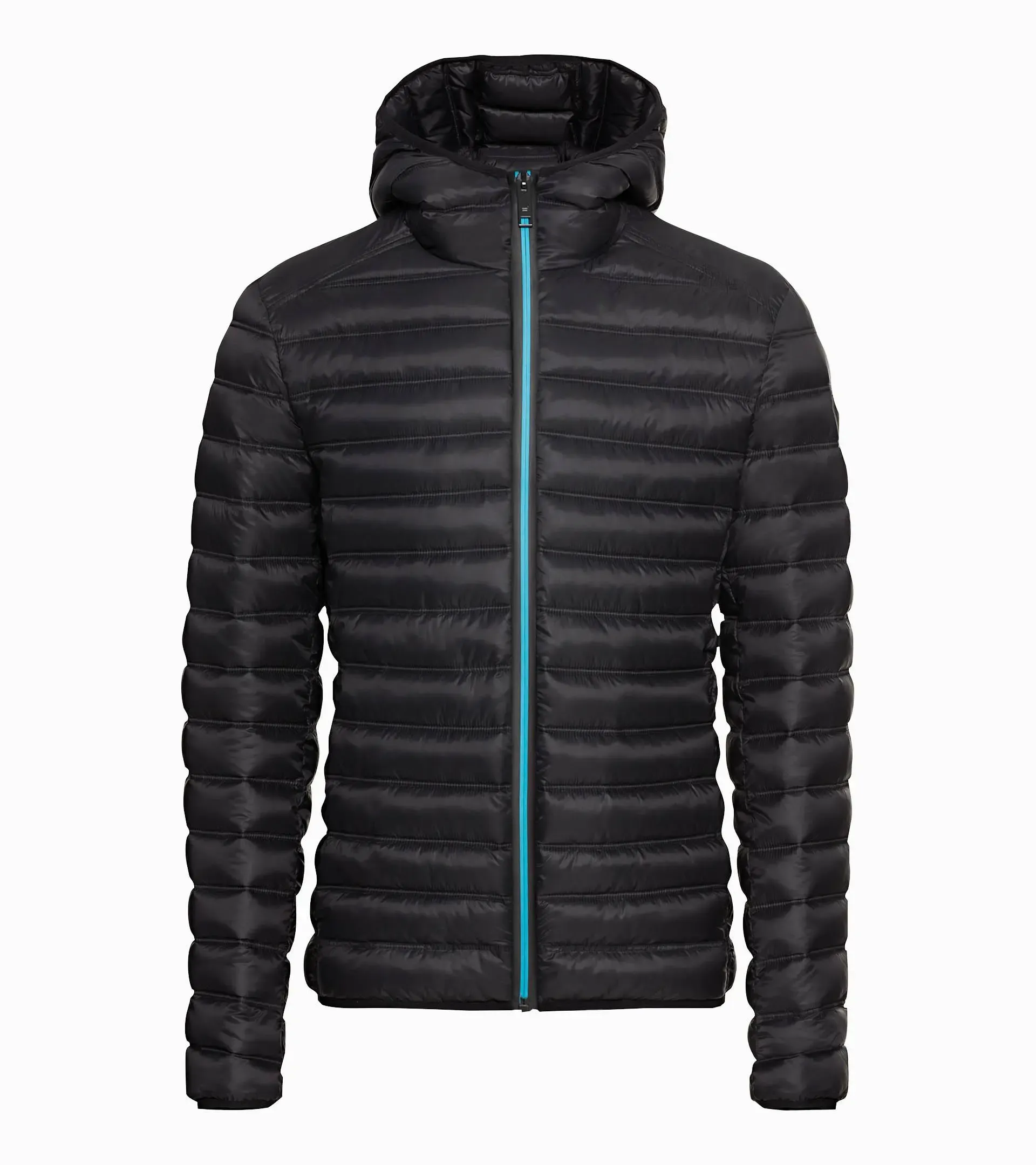 Die Porsche Design Version der klassischen Männer Steppjacke. Die Designer Jacke für Herren mit Kapuze ist aus nachhaltigem Material und daunenfrei gefüttert.
