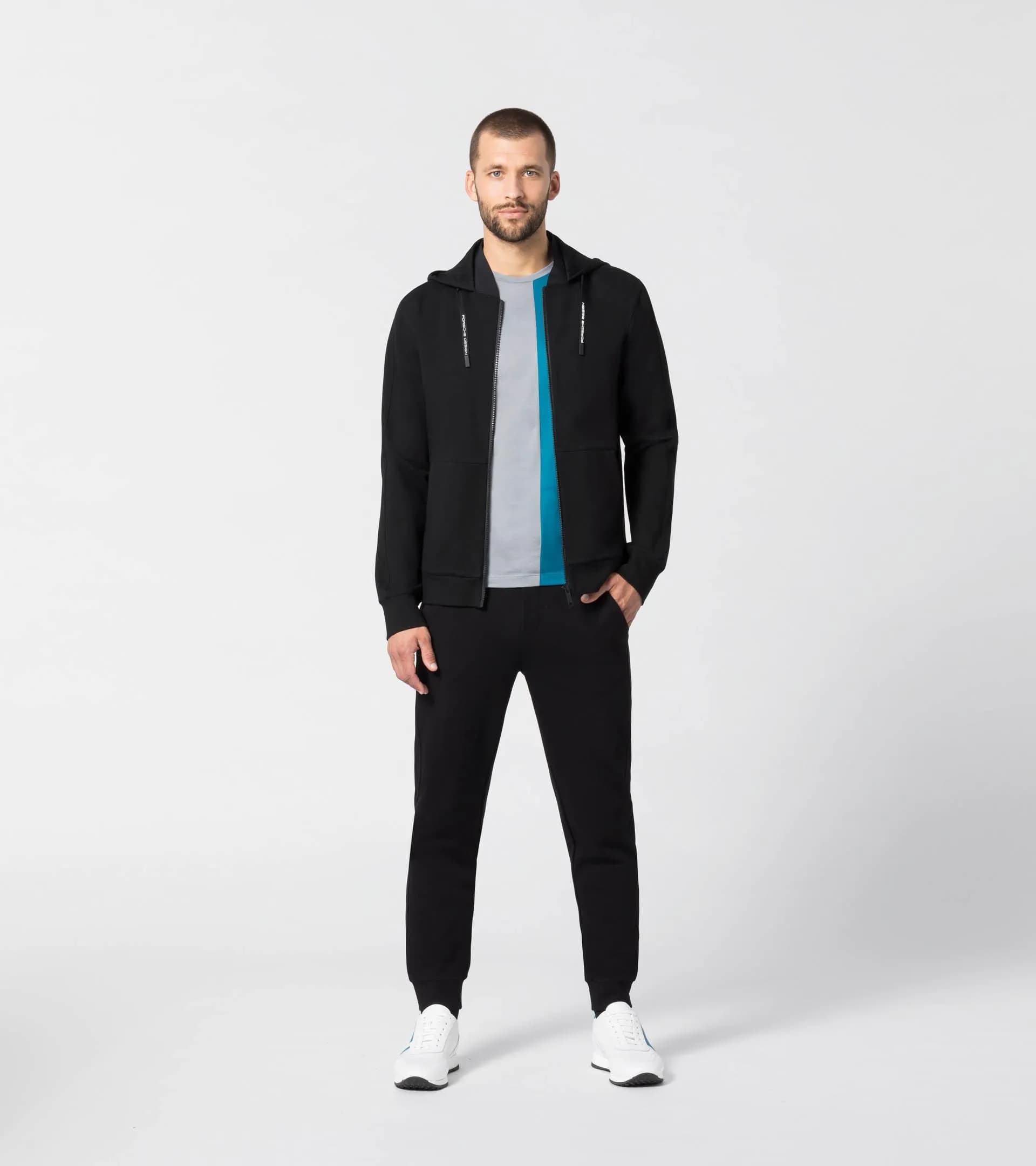 Designer Herren Sweatjacke aus bi-elastischem Jerseystoff. Mit passender Porsche Design Jogginghose wird Hoodie Trainingsjacke zum exklusiven Track Suit.
