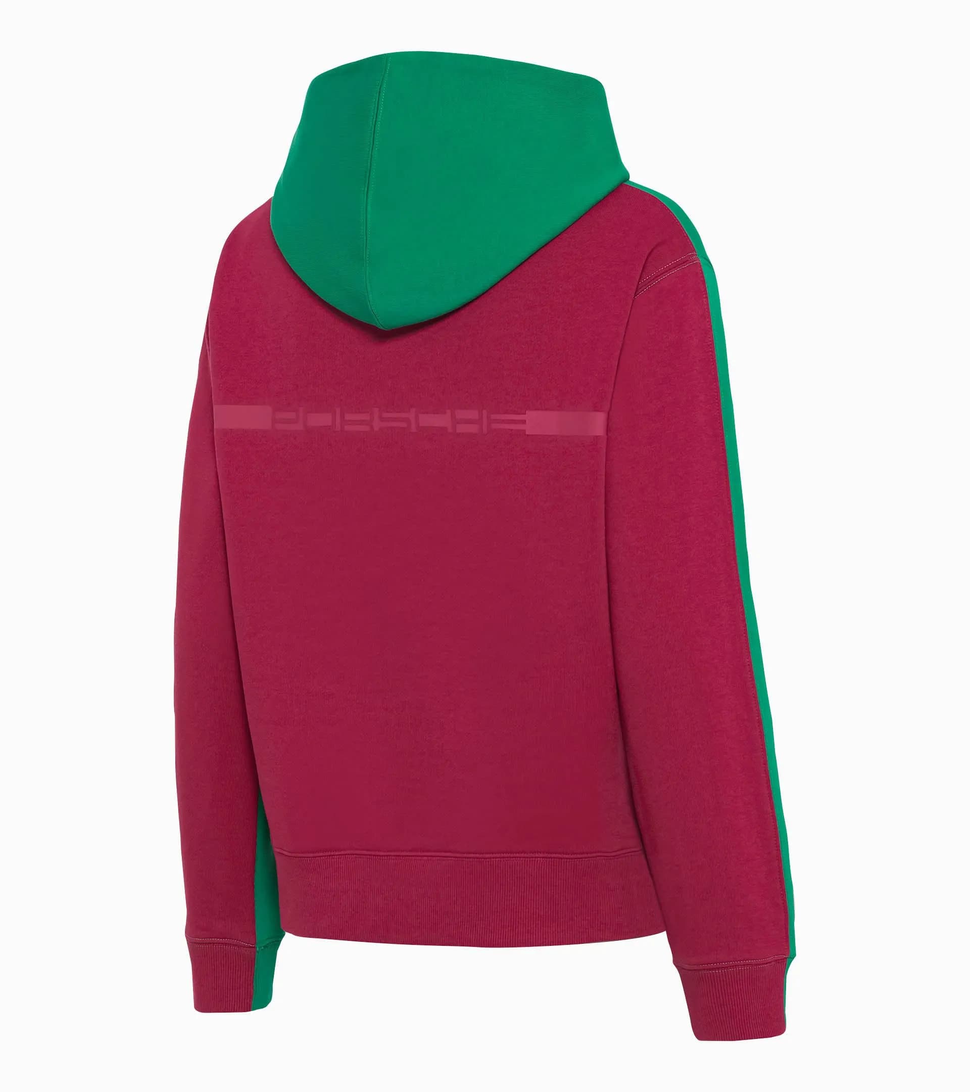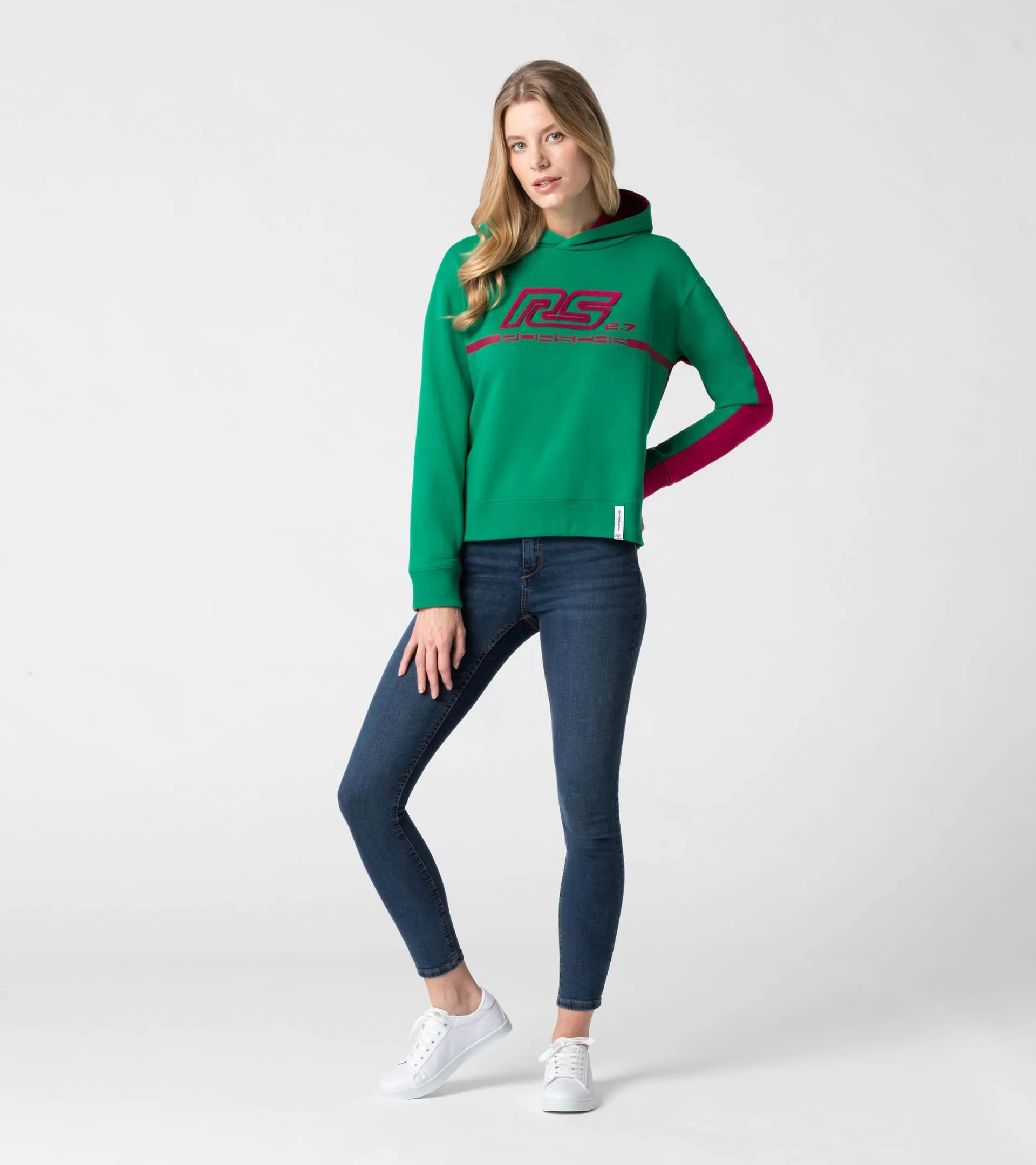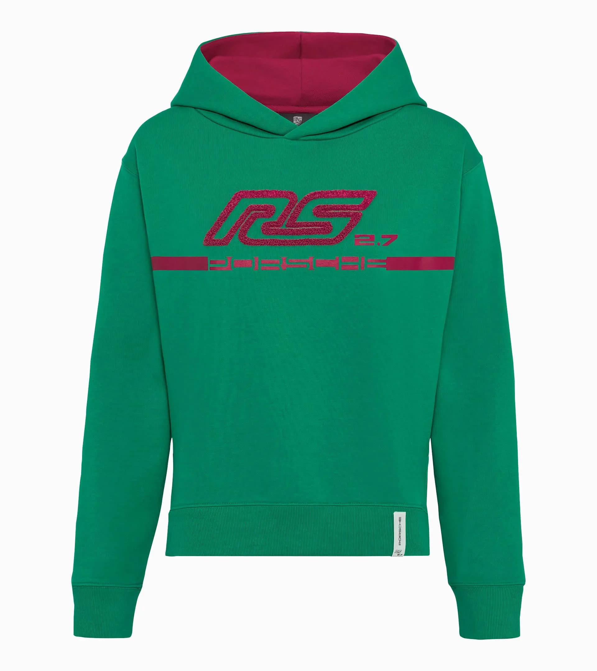 Lässig und bequem: der mit einer RS 2.7 Frottee Stickerei und Porsche Druck verzierte Kapuzenpullover für Damen. Die Farben sind inspiriert vom 911 Carrera RS 2.7, der 1972 auf dem Pariser Automobilsalon vorgestellt wurde.