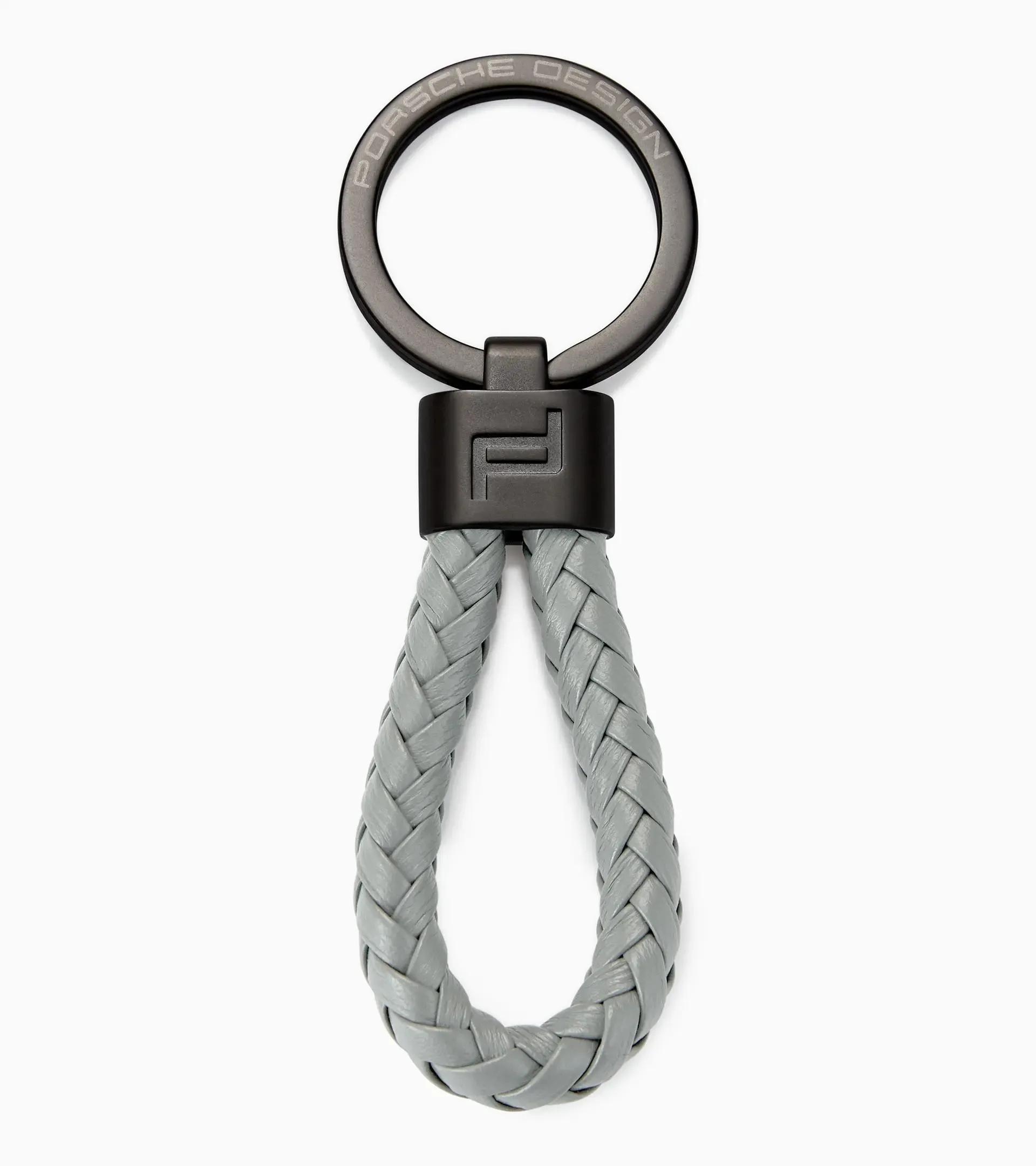 Porsche Design Schlüsselring mit geflochtenem Lederband und graviertem Spaltring.