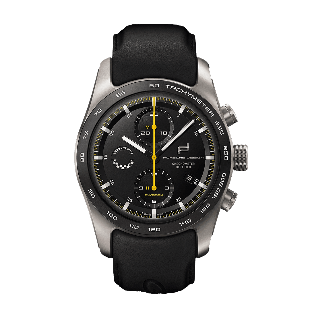 Sein aus Titan gefertigtes Gehäuse mit schwarzer Lünette ist wie für Porsche Design üblich leicht und widerstandsfähig. Der Zifferblatt-Farbring in sportlich-elegantem Achatgraumetallic lehnt sich an die Lackfarbe des Fahrzeugs an. Das mattschwarze Zifferblatt garantiert optimale Ablesbarkeit, während sich die leuchtend gelben Chronographenzeiger von dessen Drehzahlmesser ableiten. Getragen wird der Chronograph 911 GT3 mit Touring-Paket an einem stilvollen Armband aus echtem Porsche Fahrzeugleder mit „GT3“ Prägung. Die schwarze Ziernaht aus echtem Porsche Fahrzeuggarn rundet das Armband ab.