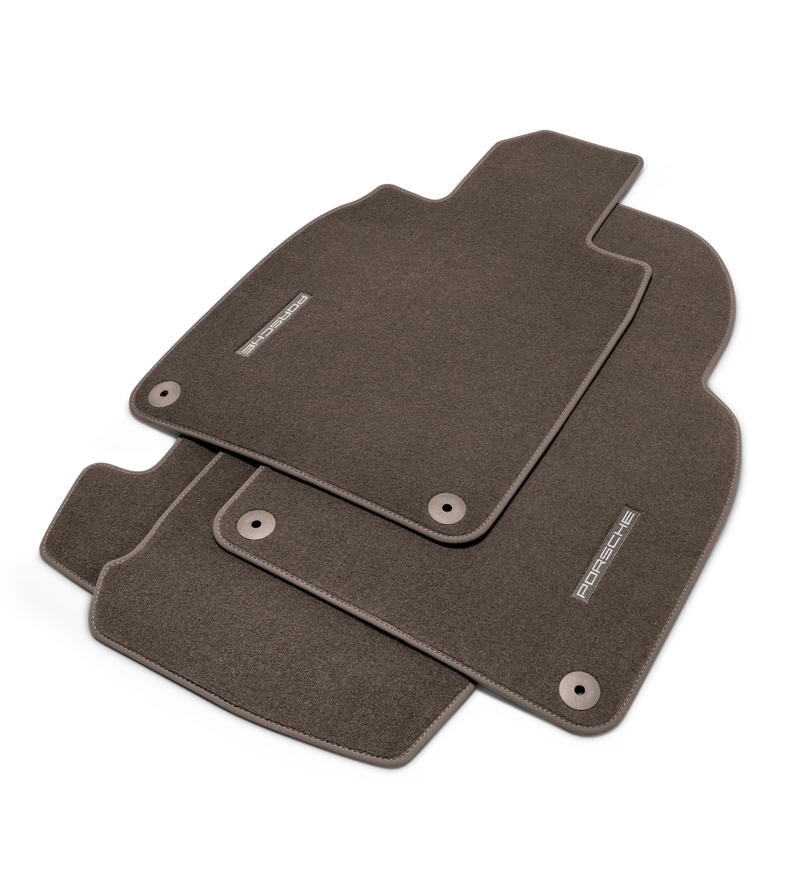 Jeu de quatre pièces dans des teintes intérieures sélectionnées, gansées de nubuck, avec la signature « PORSCHE » couleur Argent en incrustation brodée.