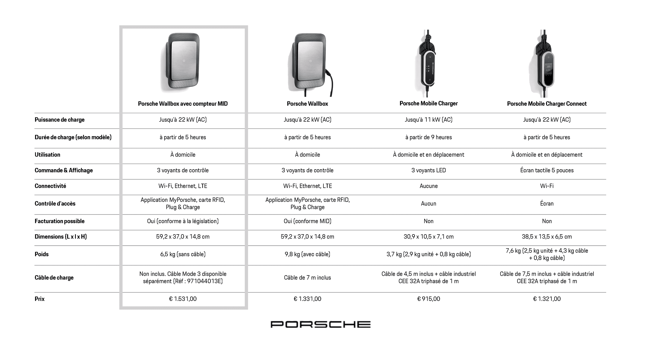 1Remarque: La Wallbox Porsche est compatible uniquement avec les véhicules respectant les normes et directives en vigueur pour les véhicules électriques. La compatibilité est garantie pour les véhicules équipés d’une prise de type 2. Le temps de charge peut varier selon le modèle de véhicule, son équipement et le pays de recharge.