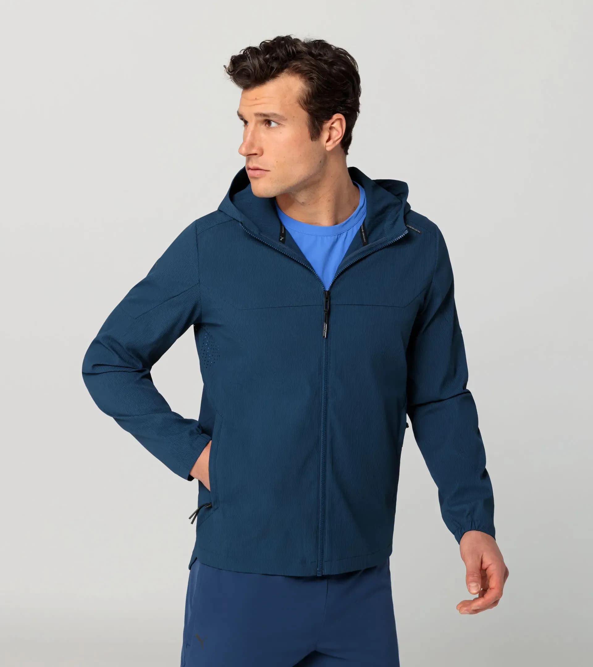 Whether on your bike, your jogging route or simply in active everyday life: this jacket demonstrates real Porsche performance. The dryCELL® technology and laser cuts under the sleeves ensure a pleasantly dry feeling at all times. The cut with a longer back section, the reflective strip in the rear seam and the adjustable hood are also suitable for sports. Visually, the jacket scores with its clean look and small details such as PORSCHE DESIGN drawstrings on the full-length front zip, PORSCHE DESIGN zip pullers on the two concealed side pockets and the PUMA x Porsche Design neck tape. A special highlight is the reversible side pocket, in which the jacket can be stowed away quickly and easily.