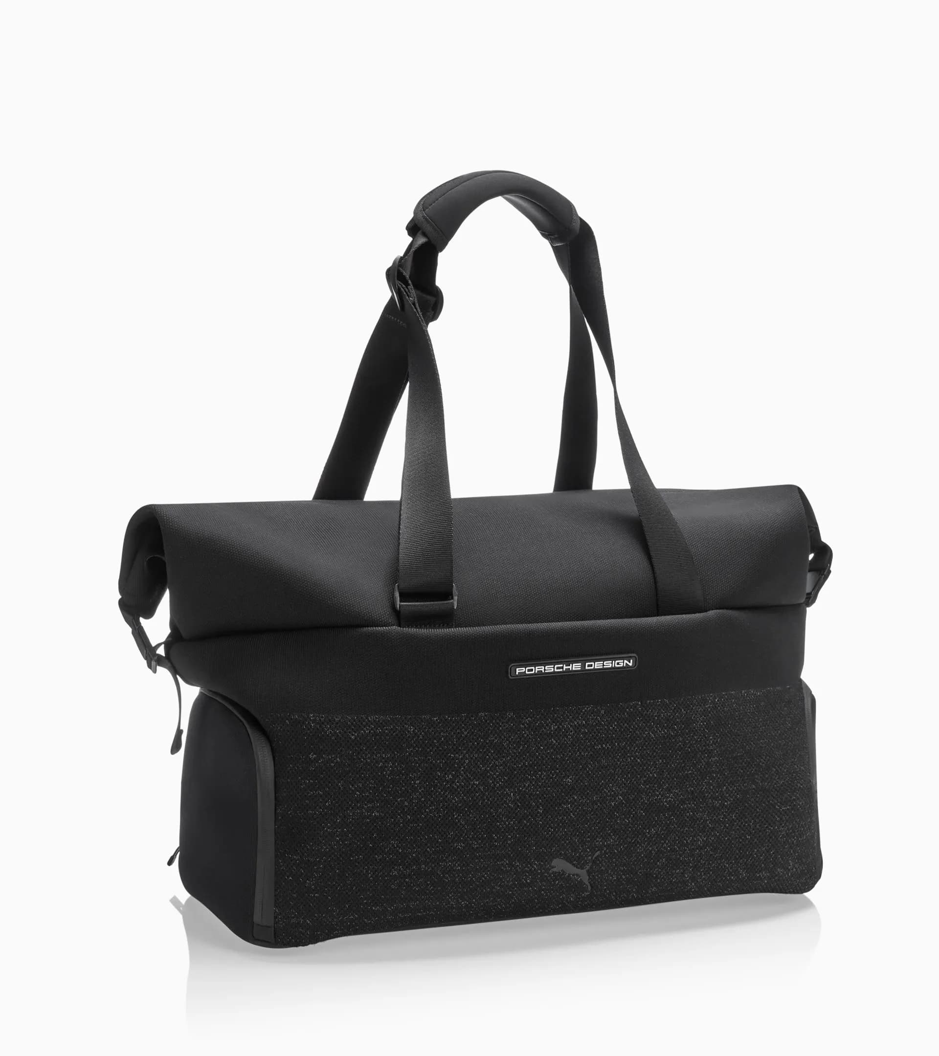 Porsche Design Duffle Bag with roll-top closure for sports, spa trips, and everyday life. This sports bag comes in a reflective performance knit fabric and can be adjusted in volume.