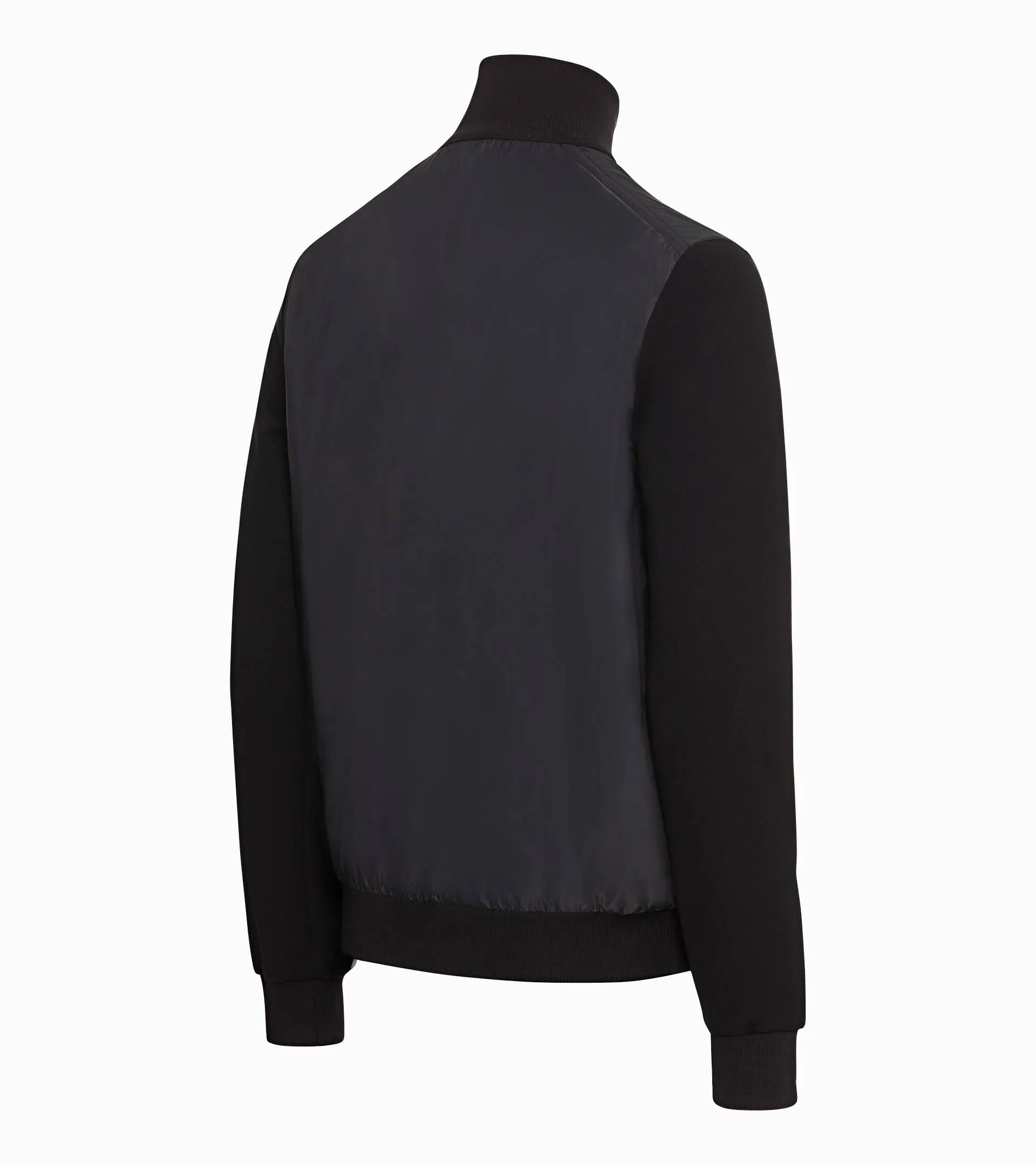 The versatile men's cardigan: the Porsche Design Functional Nylon Mix Cardigan. The stand-up collar cardigan looks extremely dynamic with its modern combination of materials and is supremely comfortable with the front and back trimmed with thin Italian nylon and sleeves in a soft cotton knit. The smart double zip can be worn in two ways for even more style and comfort. When closed "tightly", the black taped zipper gives the jacket a slim and sleek look. When closed on the second zipper, the jacket cut is slightly more generous – and the rubberized underflap with contrast stripe in bright blue is revealed. Function and design in one, for a style that can adapt to your mood and the occasion. The zippers of the vertical pockets are also taped to emphasize the sleek, technical character of the cardigan, while a PD Icon badge on the upper arm as well as custom Porsche Design details highlight the exclusive manufacturing. It is not for nothing that this hybrid is a Porsche Design bestseller.