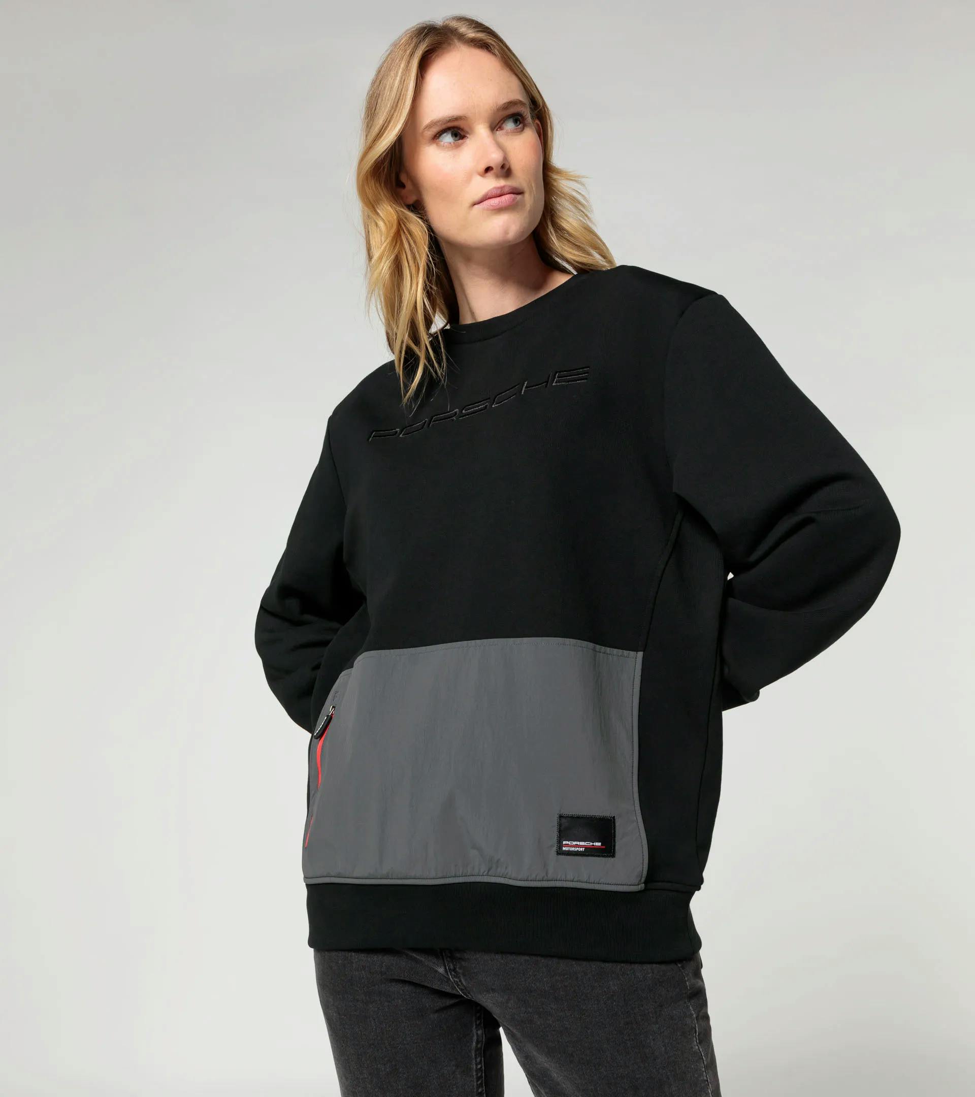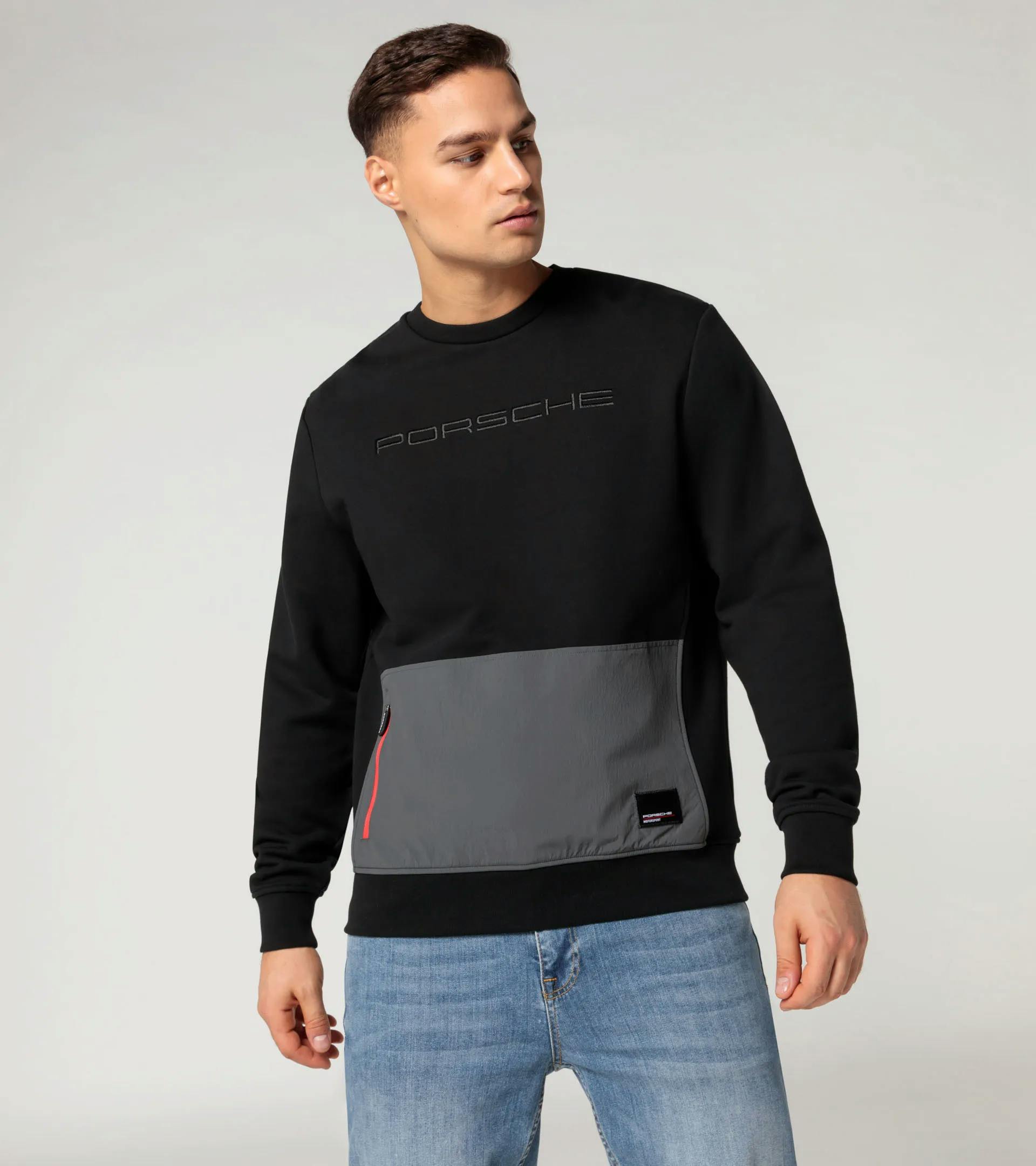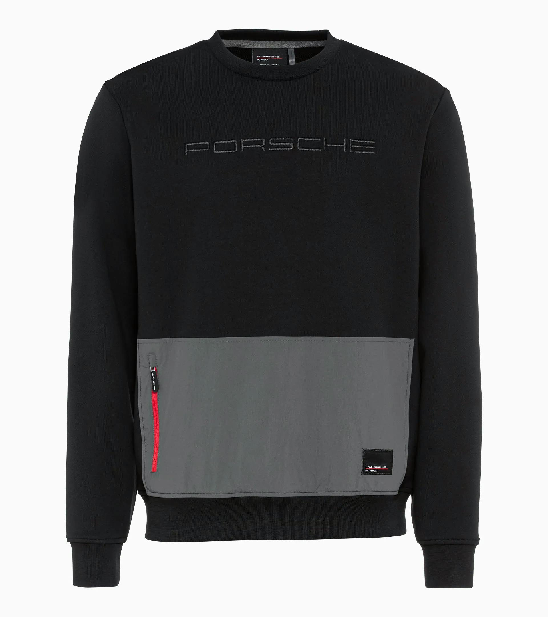 Racing spirit, stylish design and quality combined in a single collection – with Motorsport Fanwear. The pullover made from organic cotton and recycled nylon is the ideal solution for environmentally conscious Porsche fans on cooler days. With Porsche embroidery on the front and the Porsche Motorsport label on the lower front, the pullover is a real must-have for Porsche fans. A small zipped pocket offers space for a smartphone, etc. The branded zip pulls are a design detail that perfectly rounds off the look of the pullover.