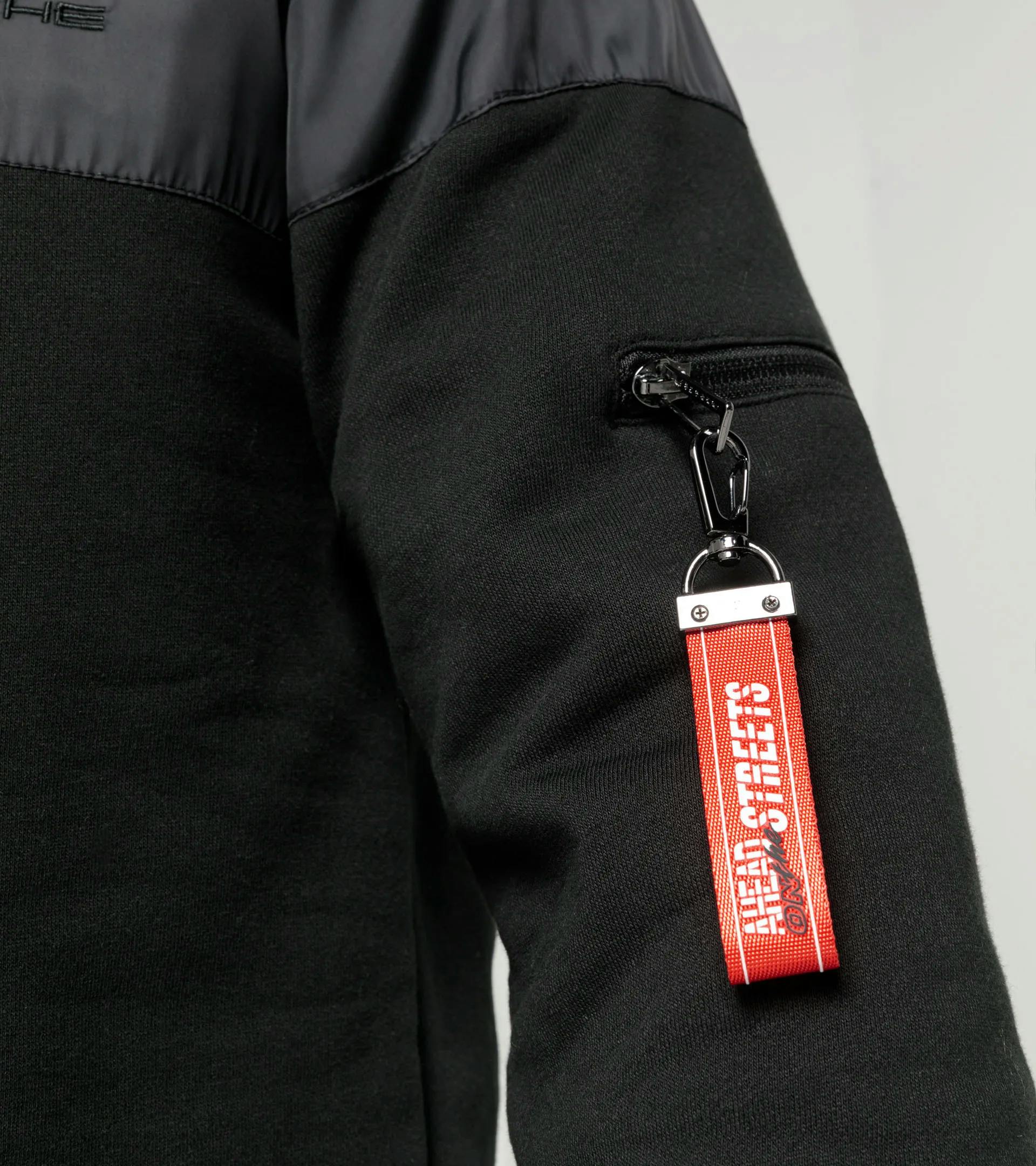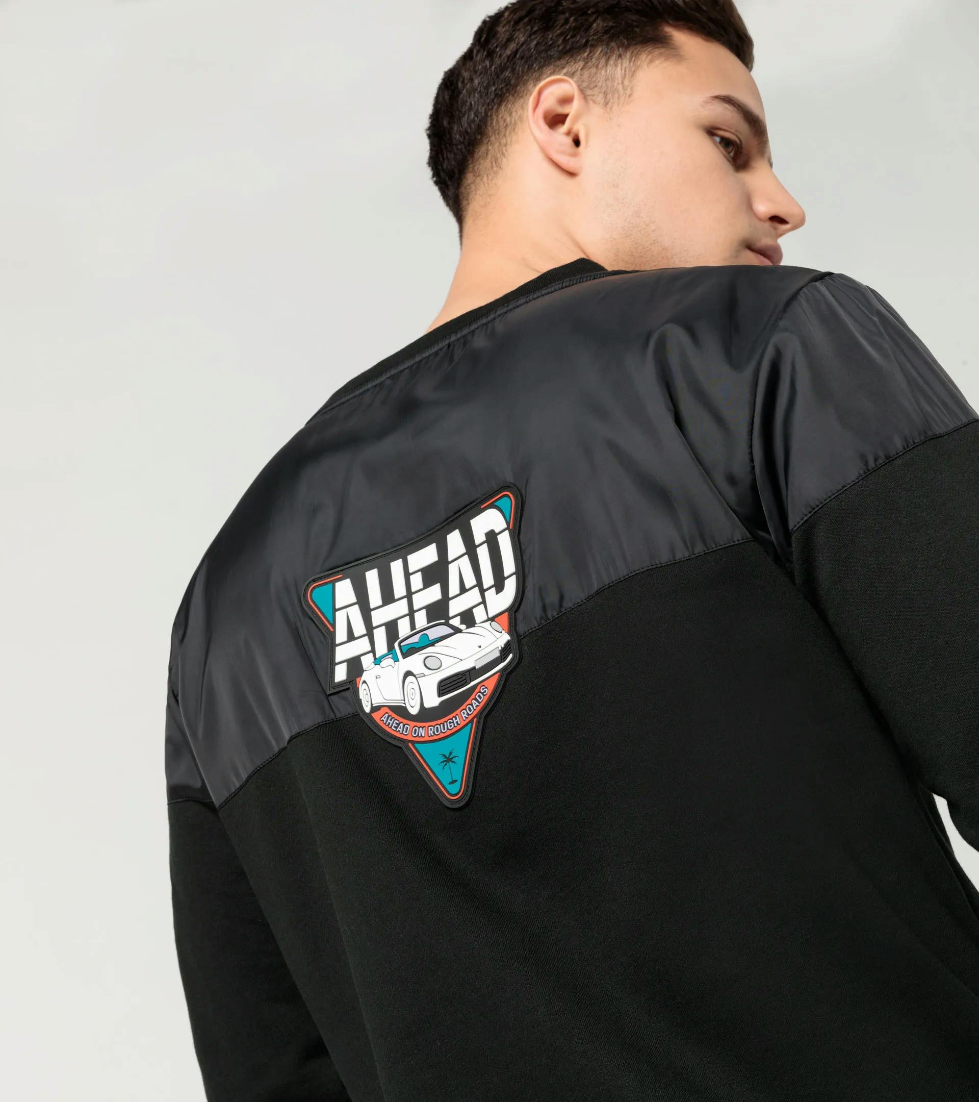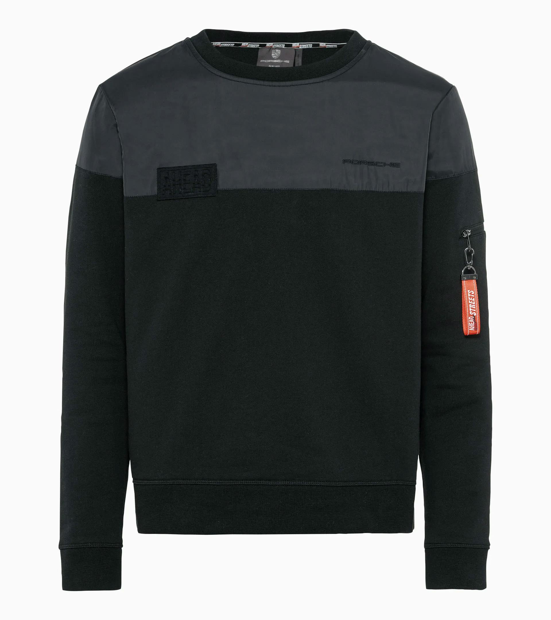 Road trip meets lifestyle: the AHEAD Collection combines pioneering spirit and a thirst for adventure with iconic design. The sweater impresses with its casual fit, which is emphasised by the crew neck and the slightly dropped shoulders. The upper part made of fine nylon and the lower part made of high-quality cotton offer a contrast of textures that underlines the modern design. The Porsche lettering, embroidered in the same colour on the left side of the chest, and a sewn-on AHEAD badge on the right side add special highlights. The zip pocket on the left sleeve, equipped with an eye-catching AHEAD zip puller, is a practical touch. On the back, a large AHEAD badge completes the look. As an added extra, a removable key ring with the word 'AHEAD' is attached to the side pockets.