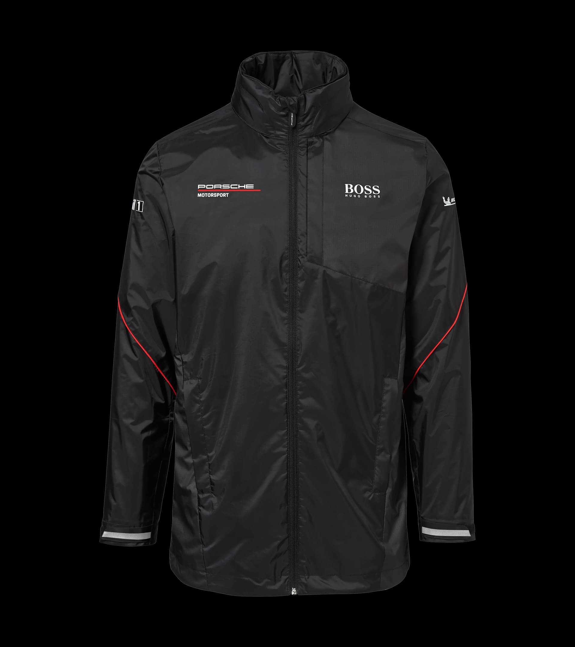Breathable rain jacket, visually reminiscent of original Porsche Motorsport teamwear. With stand-up collar, foldable hood and zip fastening.