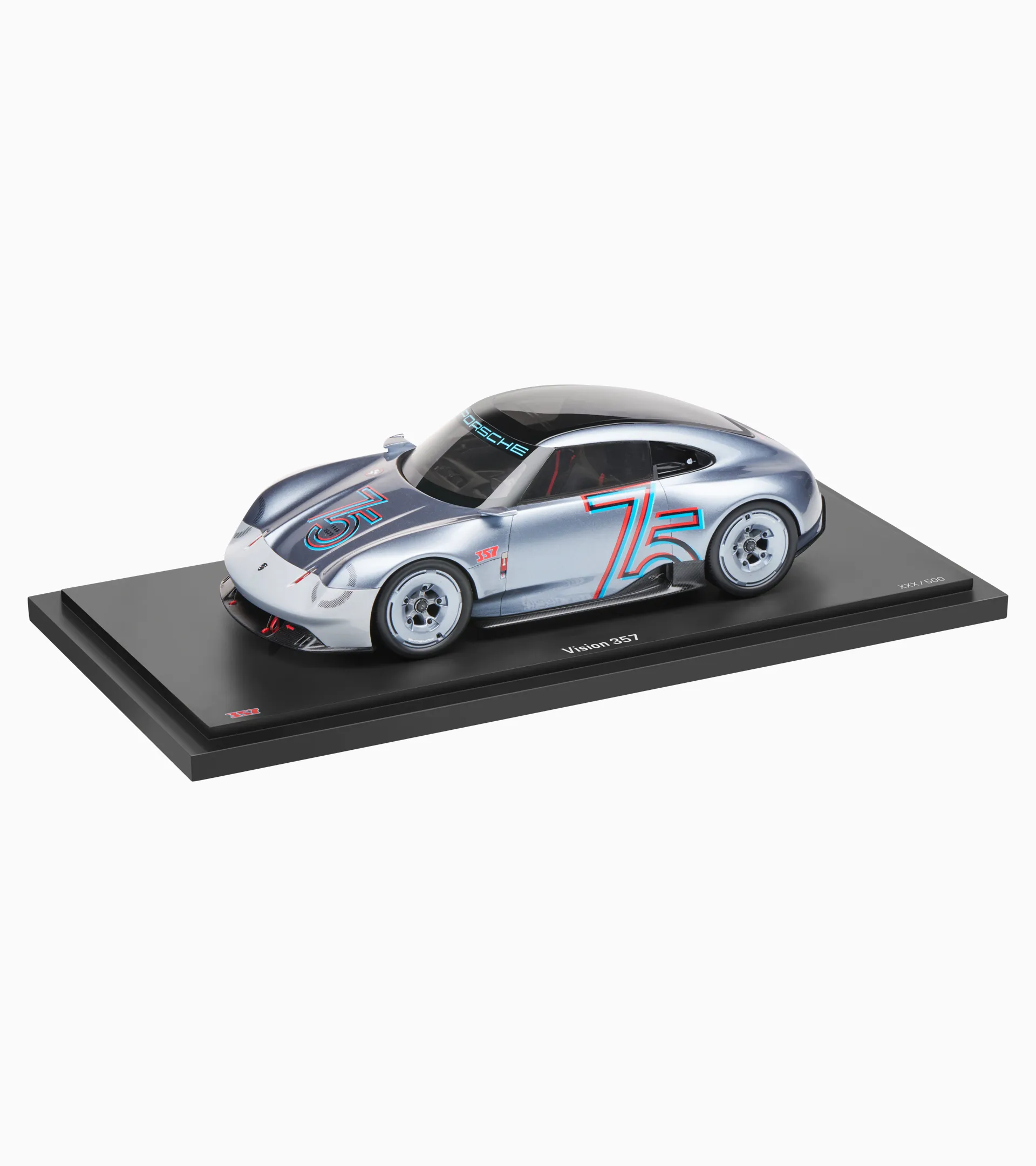 The exclusive 1:18 scale model of the Porsche Vision 357 showcases impressive attention to detail and deserves its place in any collection. With the included exclusive packaging, it becomes the perfect gift for every Porsche fan. Made of resin. Silver exterior, Black interior.