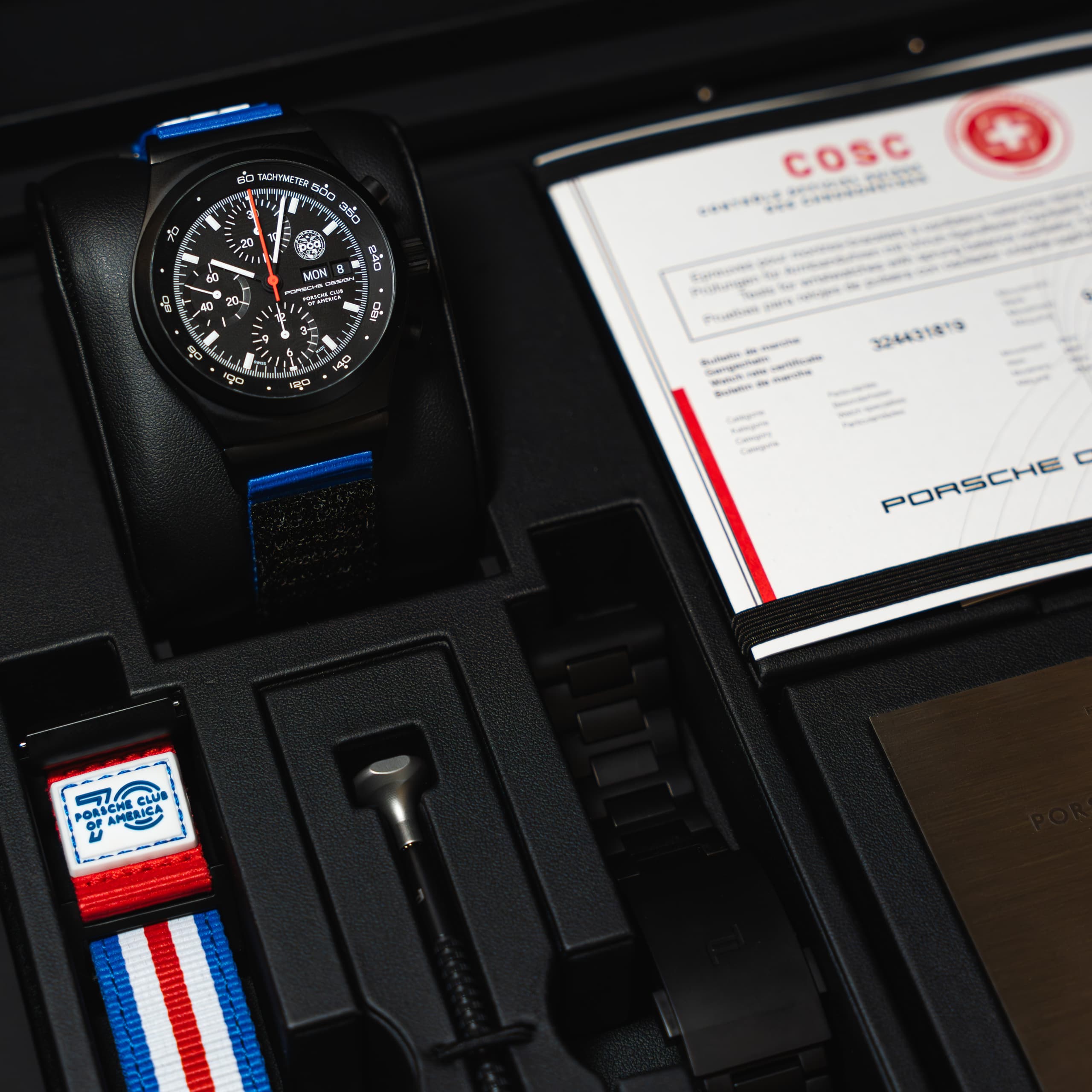 The Chronograph PCA - Member Edition comes in an exclusive Porsche Design timepiece box, featuring a unique engraved plaque engraved with "EXCLUSIVELY MANUFACTURED" or "PCA Region Name".