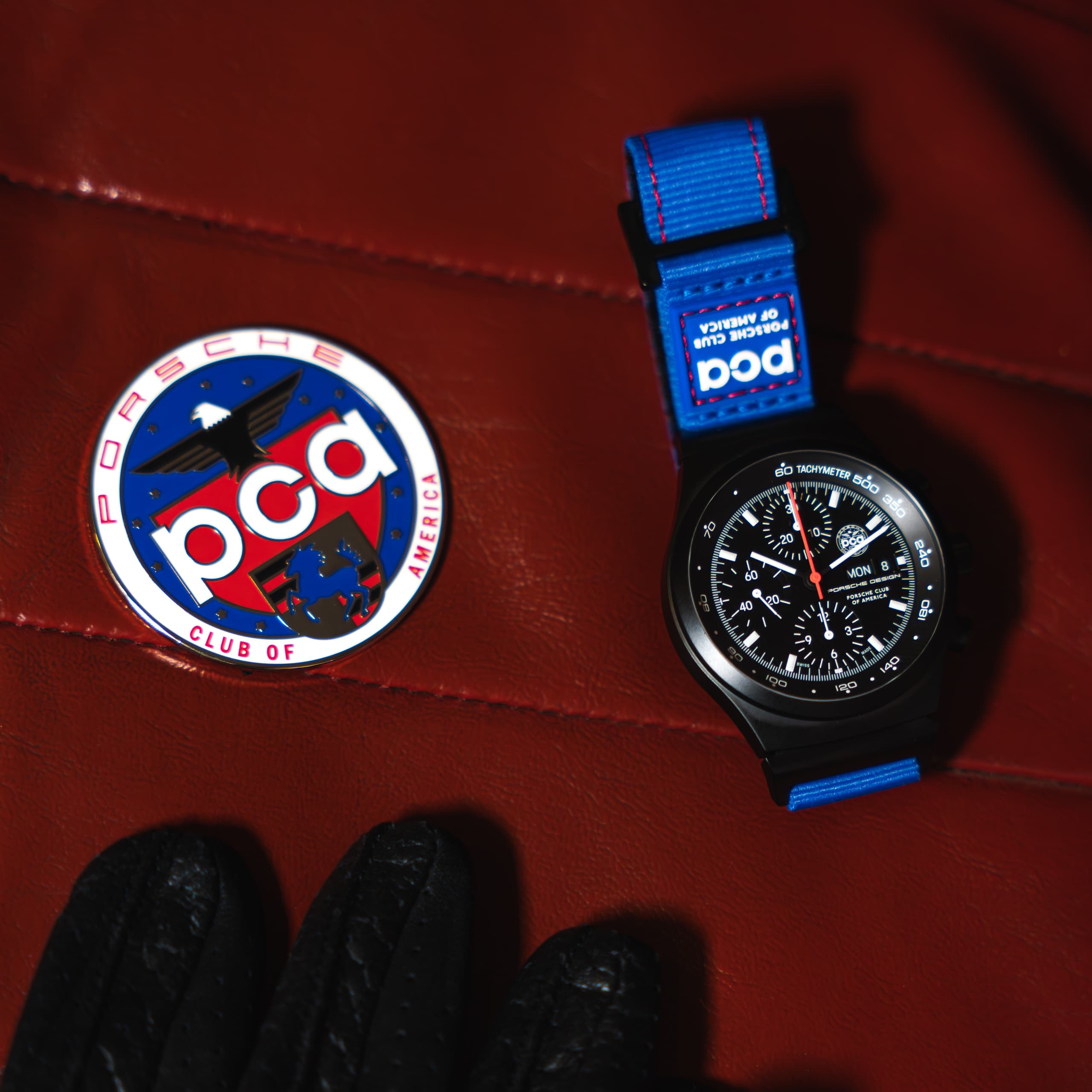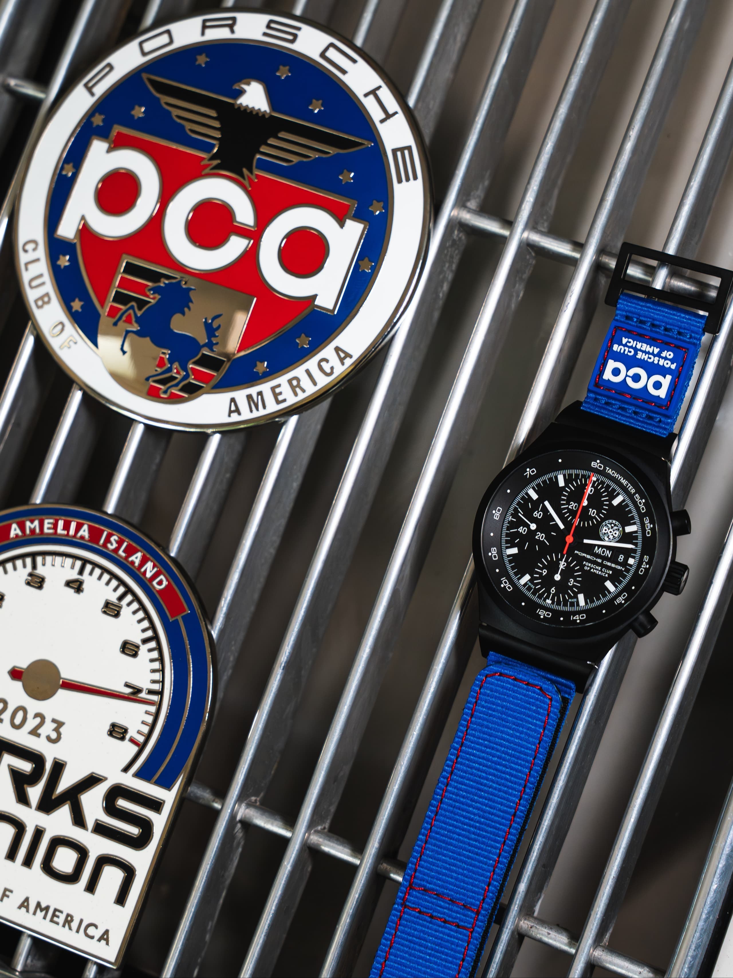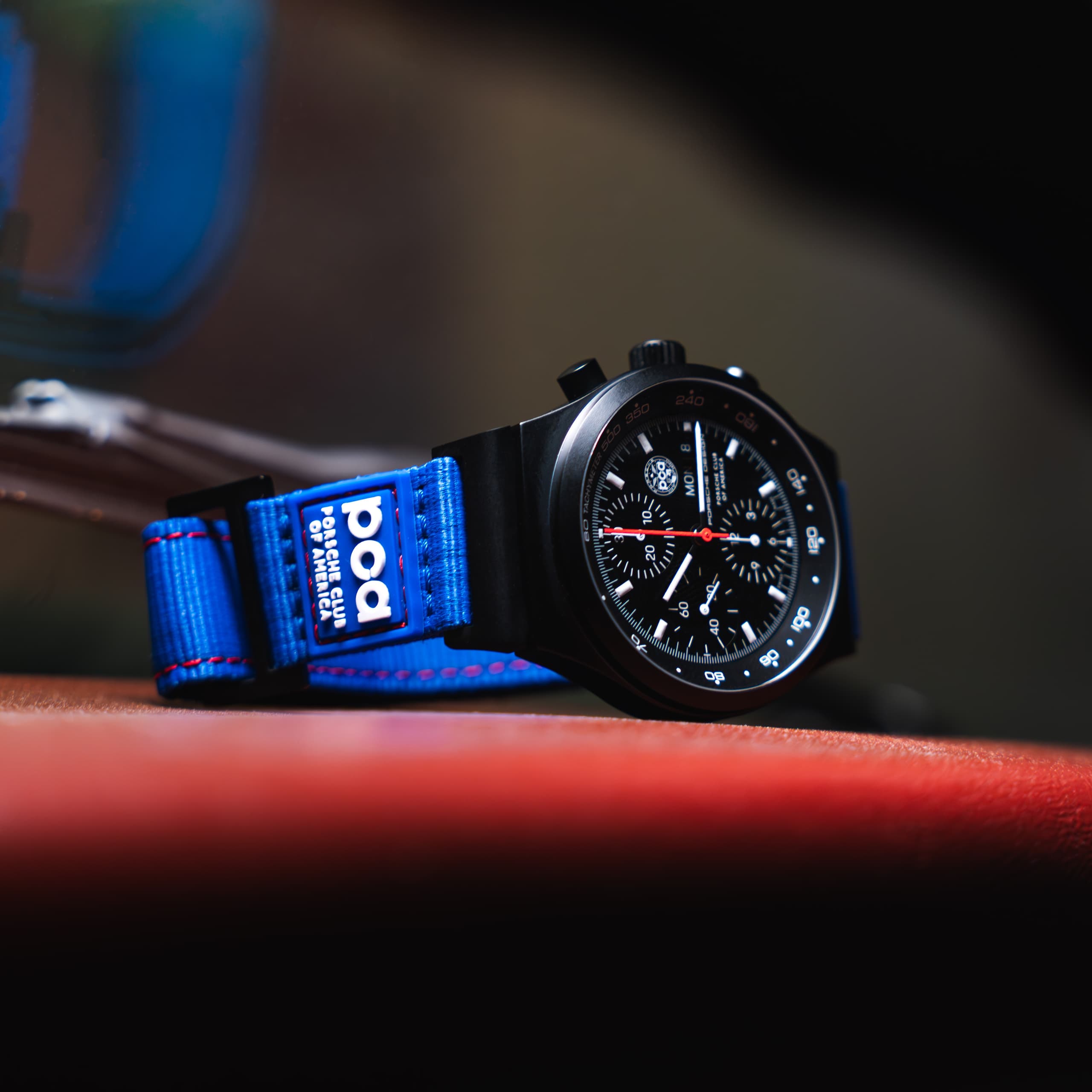 in addition to the regular titanium bracelet, the watch comes with a textile strap in Club Blau featuring the PCA logo. And those, who purchase this extraordinary timepiece by September 30, 2025, will receive a special anniversary gift: the "70-Year Anniversary" strap designed in PCA's red, white and blue colors, and featuring the "70 Years Porsche Club of America" anniversary logo.