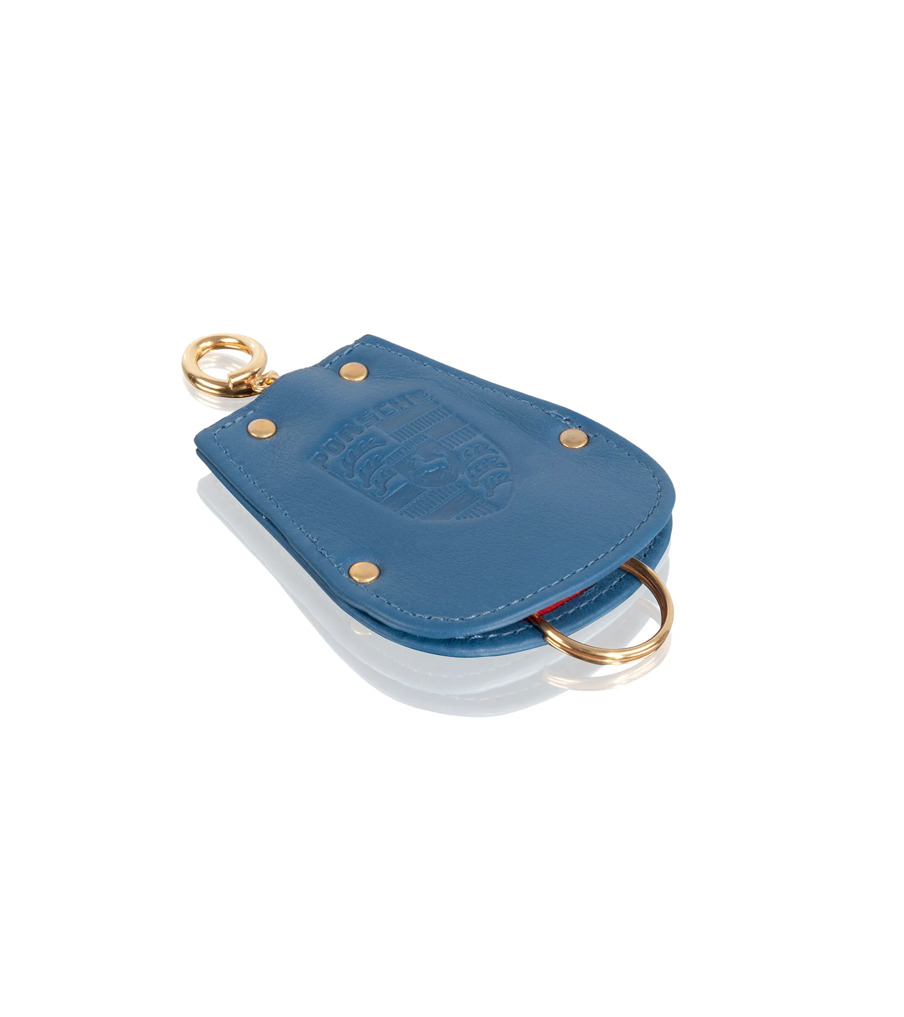 La pochette à clés Reutter Porsche Classic présente un fini en cuir lissé bleu, avec l’écusson Porsche centré à l’avant et l’écusson Reutter centré à l’arrière. À l’intérieur, une chaîne à anneau plaquée or traverse l’ouverture du haut et du bas. Un anneau à ressort plaqué or pour accrocher la clé est fixé à la chaîne avec une boucle en métal soudée au dos. L’intérieur est en cuir lissé.