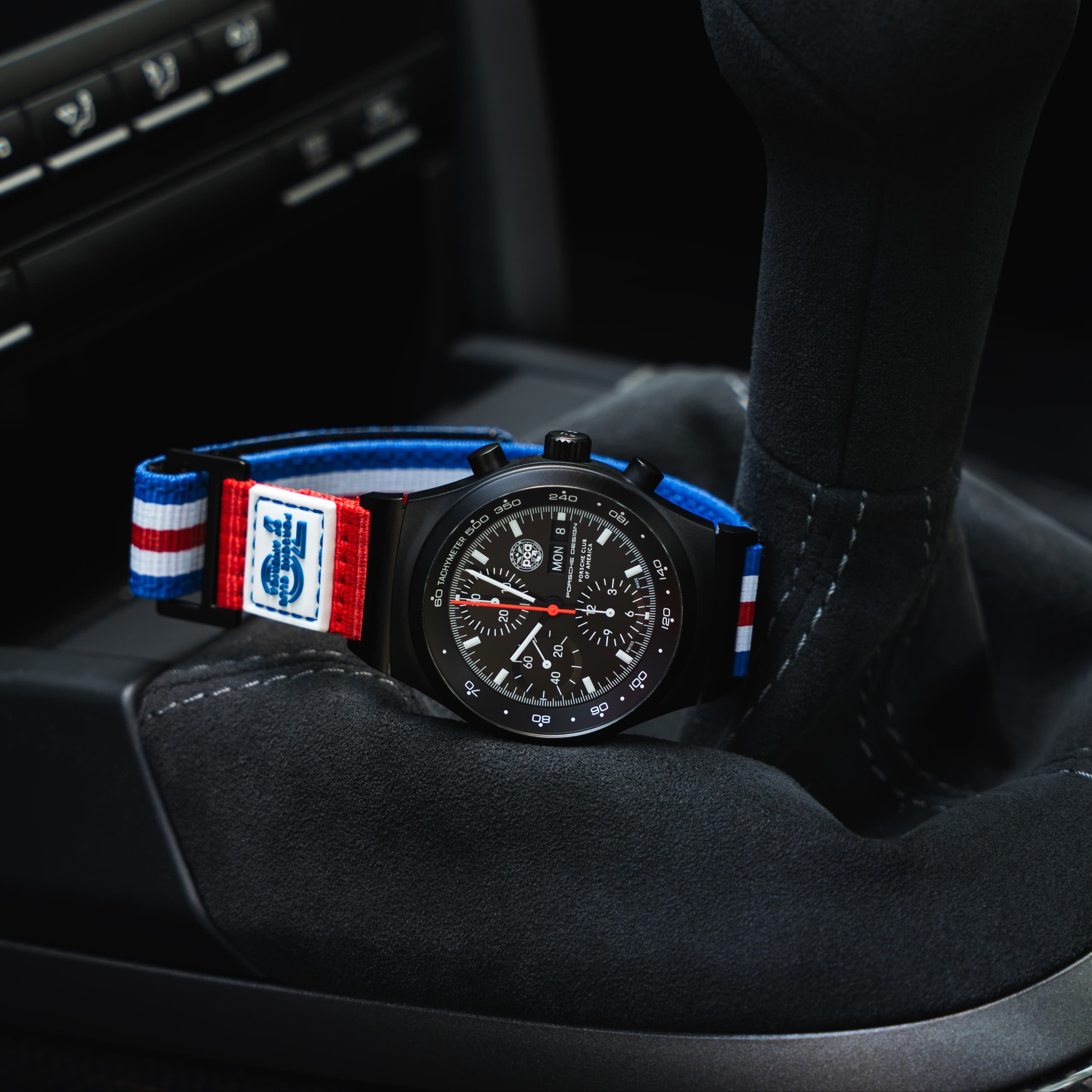 En plus du bracelet en titane classique, la montre est livrée avec un bracelet textile Club Blau arborant le logo du PCA. Et ceux qui achèteront cette montre d’exception avant le 30 septembre 2025 recevront un cadeau anniversaire spécial : le bracelet « 70e anniversaire », conçu dans les couleurs rouge, blanc et bleu du PCA, et orné du logo commémoratif « 70 Years Porsche Club of America ».
