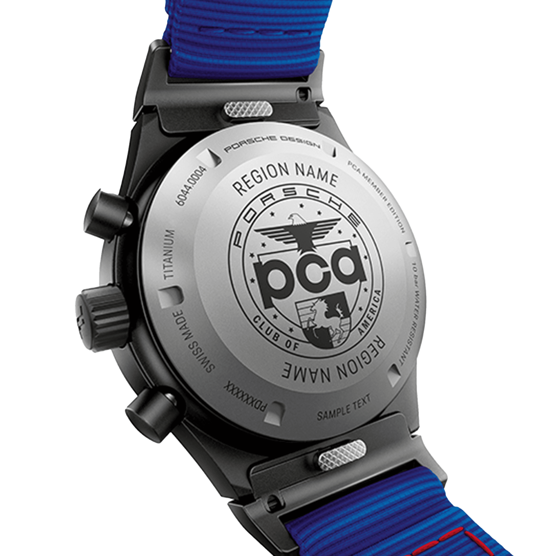 Le Chronographe – Édition Membre PCA est livré dans un écrin exclusif Porsche Design, avec une plaque gravée unique portant la mention « EXCLUSIVELY MANUFACTURED » ou le nom de la région PCA.