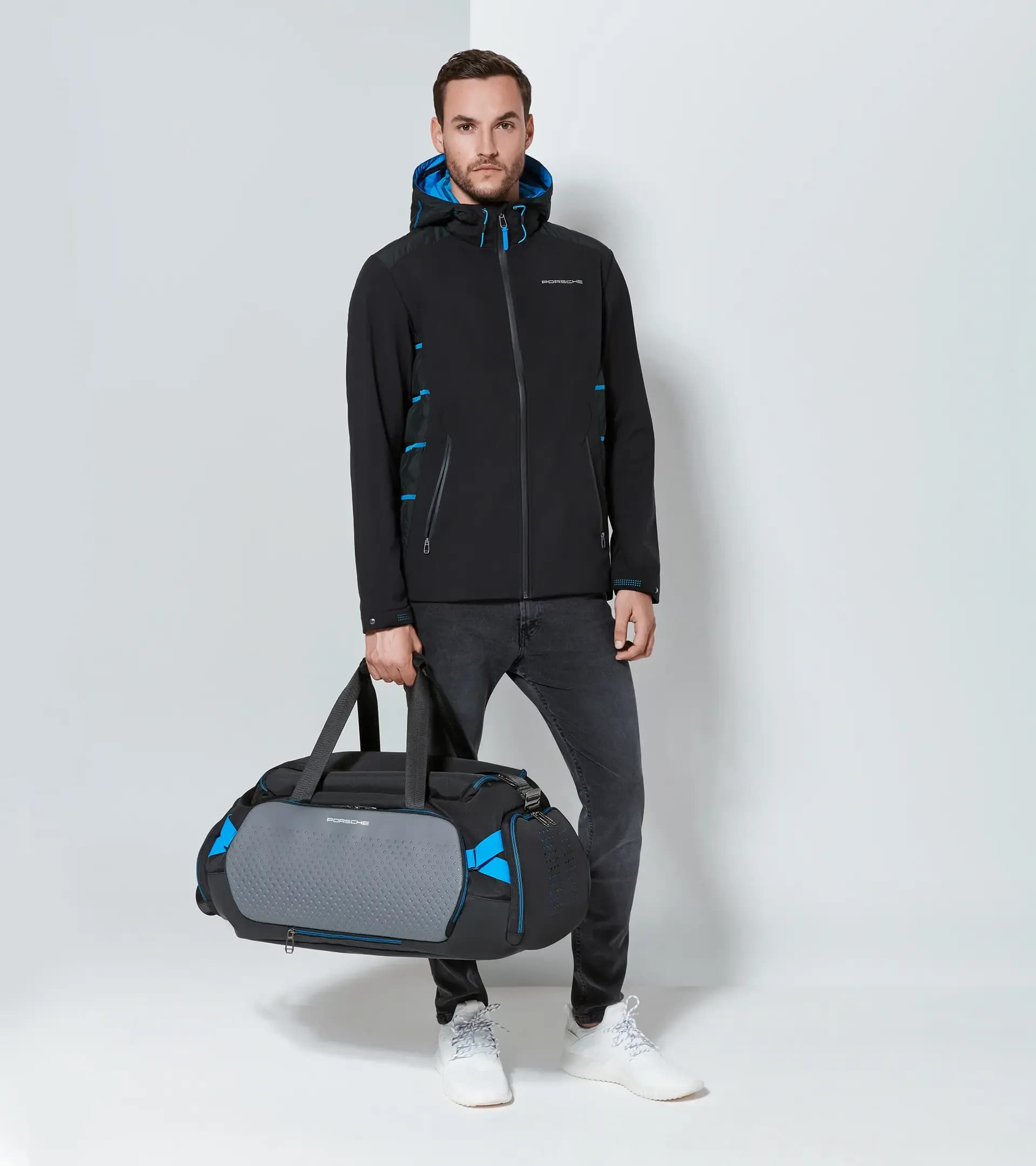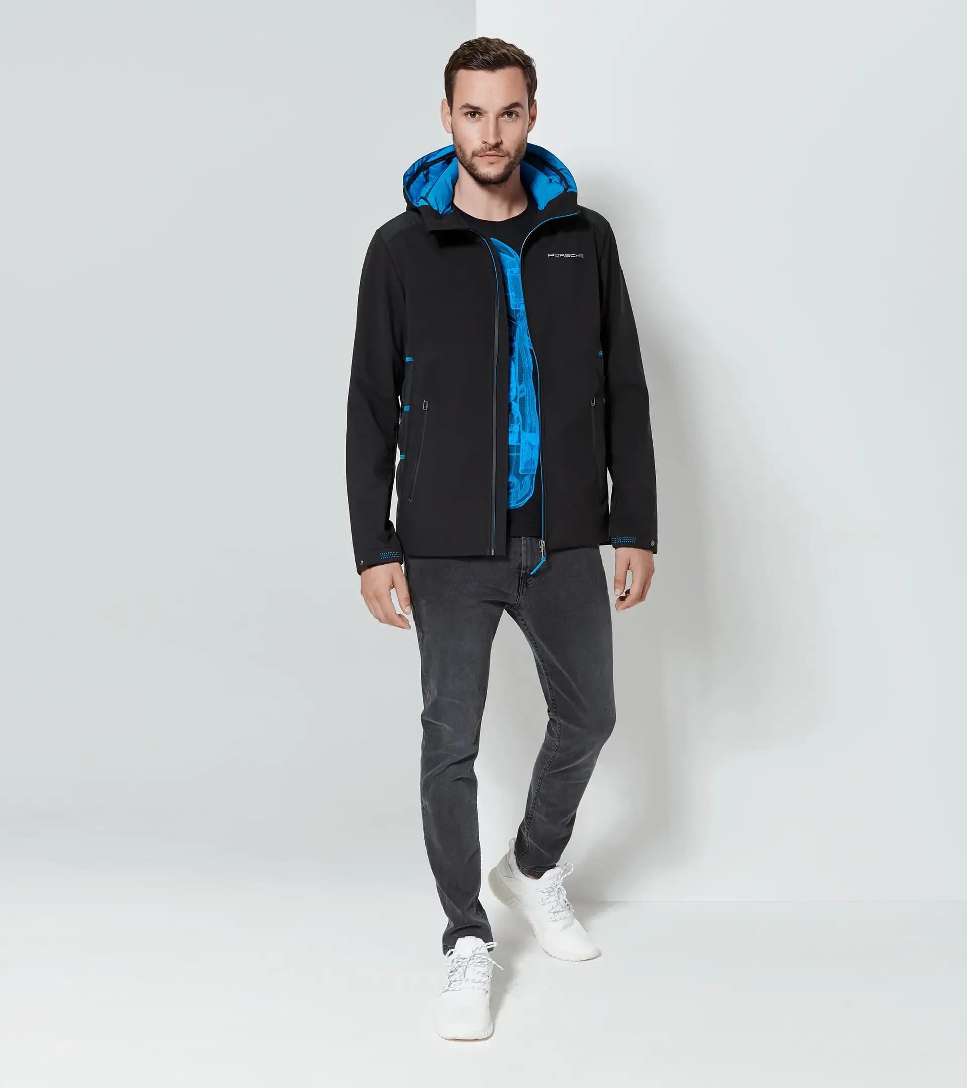 Wattierte Jacke mit Kapuze. Wassersäule 3.000 mm [Wasserdruck in Millimeter, die das Obermaterial standhält, bevor Wasser eindringt] und Atmungsaktivität 3.000 g/m²/24h [Menge der verdunsteten Flüssigkeit in Gramm pro Kubikmeter in 24 Stunden]. Vorderteil, Ärmel und Saum an Rückteil aus Hardshell-Gewebe mit Fleece-Innenseite. Kapuze, Schultern, Rücken und Seitenteile aus wattierten, kontrastgewebten Kammern. Mit lasergeschnittenen Reißverschluss-Seitentaschen. Ärmelriegel mit verdeckten Druckknöpfen. Dekorative Akzente: reflektierender „PORSCHE“ Schriftzug auf der Brust und Perforierung an den Ärmelriegeln.
