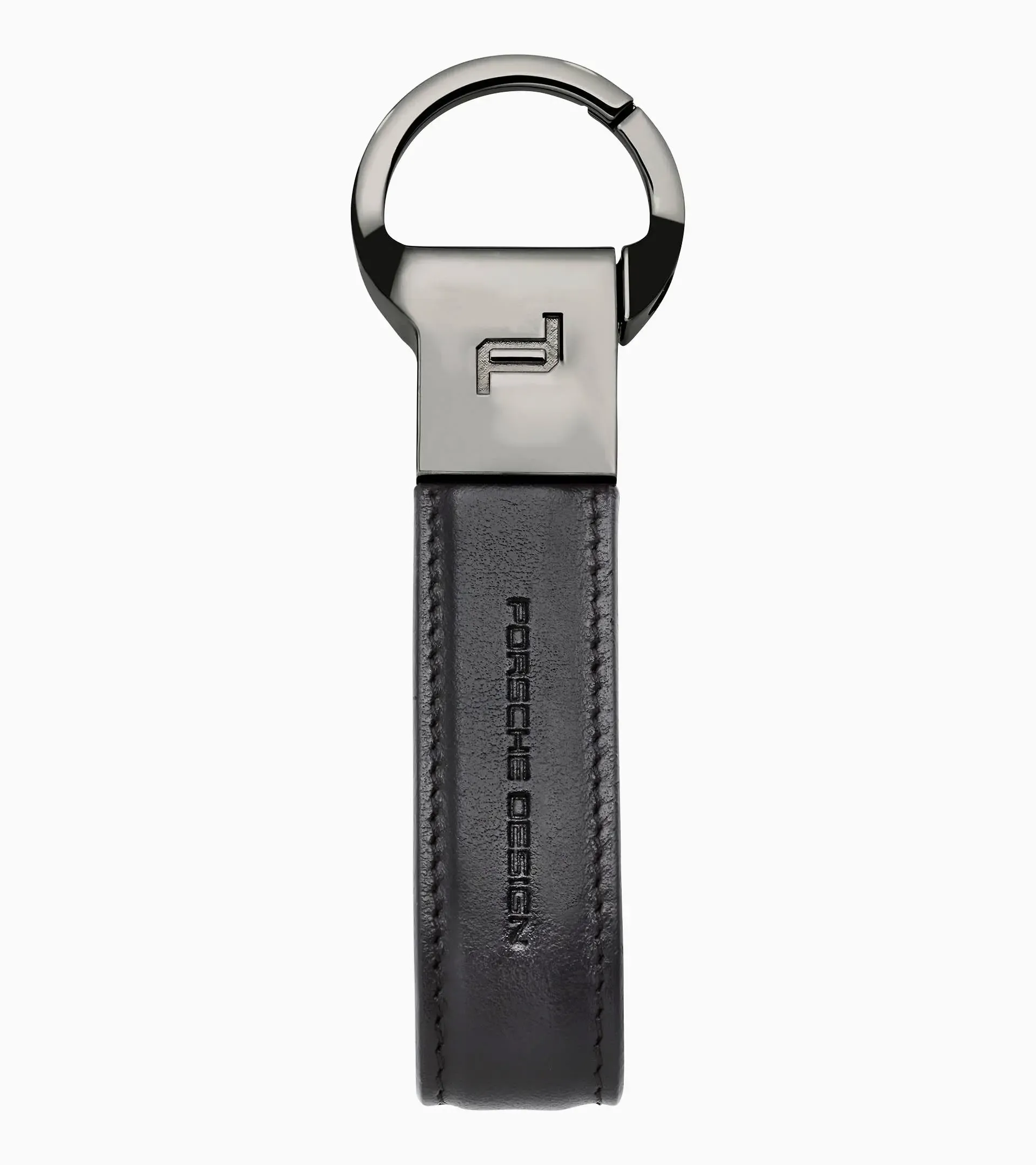 Sicher, technisch innovativ, elegant: Leder Schlüsselanhänger mit Federmechanismus statt Schlüsselring. Porsche Design Details auf Verschluss und Lederschlaufe.