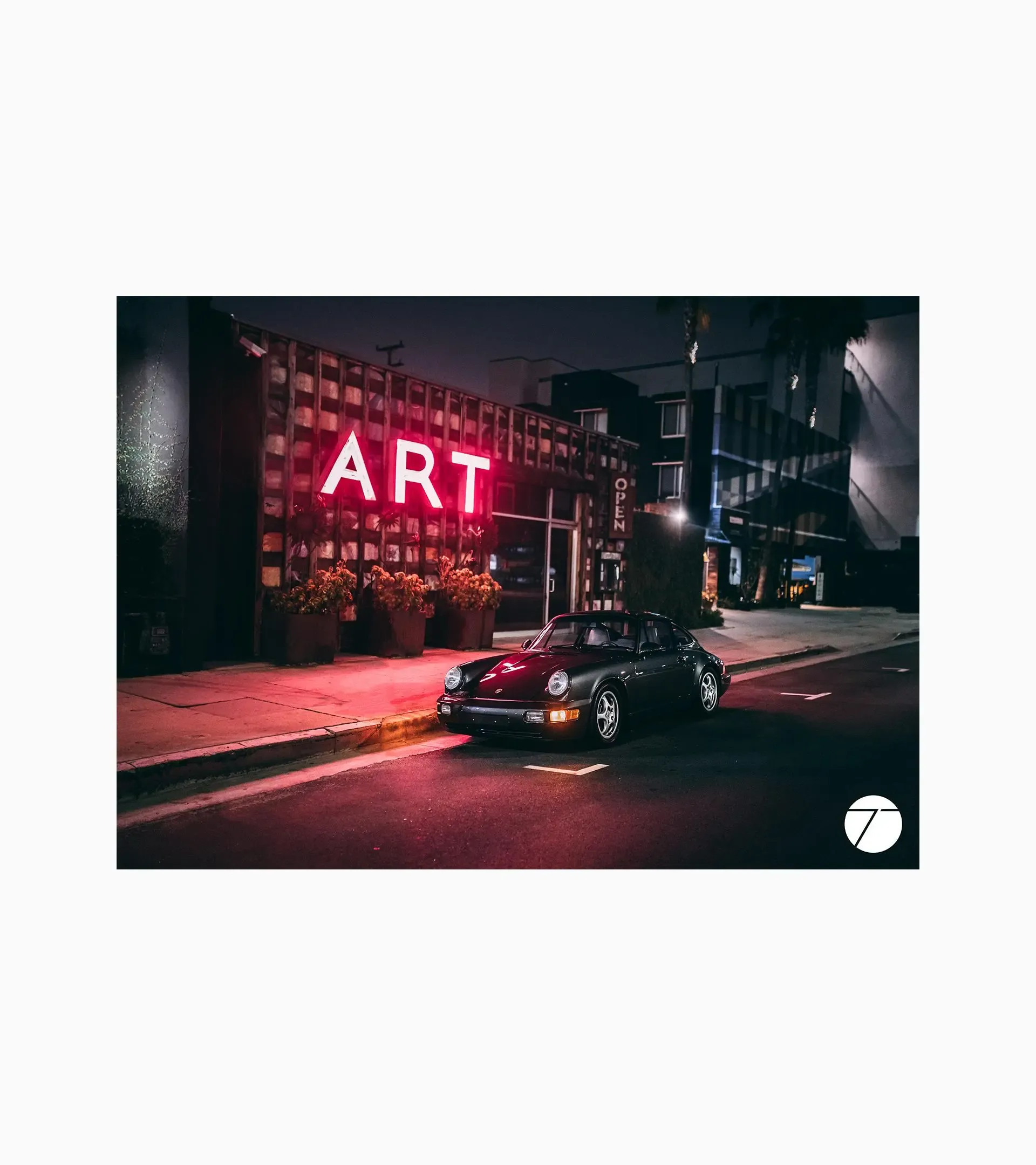 Ein Porsche hat nur Schokoladenseiten: Das beweisen die kunstvoll von Stephan Bauer fotografierten Motive, der Type 7 von Anfang an begleitet und unterstützt hat. Für dieses exklusive Poster Set, das aus zwei Motiven besteht, setzte er den Porsche 911 Carrera 2 (964) unter den schimmernden Neonlichtern L.A.s perfekt in Szene. Eine Hommage an ein besonderes Fahrzeug und eine besondere Zusammenarbeit.