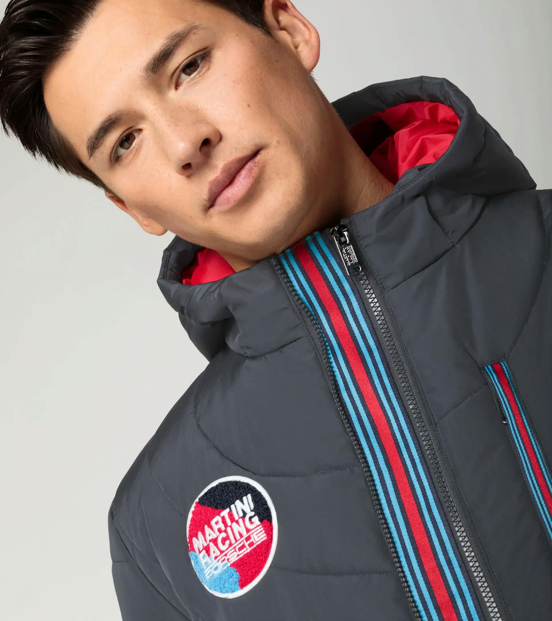 Die perfekte Kombination von Style und Funktionalität: Die Steppjacke aus der berühmten MARTINI RACING® Collection ist ein echter Hingucker und punktet darüber hinaus mit praktischen Features. So lässt sie sich per Reißverschluss um mehrere Zentimeter weiter stellen, wodurch das gestreifte MARTINI RACING® Tape erst sichtbar wird. Reißverschluss-Taschen auf der linken Brust und der Innenseite bieten ausreichend Stauraum, um Wertsachen vor Wind und Nässe zu schützen. Der Saum und die Kapuze können ganz einfach über einen Kordelzug verstellt werden. An kälteren Tagen punktet die Jakce mit aufwändiger Futterverarbeitung samt MARTINI RACING® Druck und Story-Label. Optische Highlights sind das kultige Streifendesign auf der Brusttasche und den gestrickten Ärmelbündchen, der Porsche-Schriftzug auf dem linken Ärmel, das Streifentape mit MARTINI RACING® PORSCHE-Logo auf der Kapuze sowie das hochwertige Badge auf der Brust.