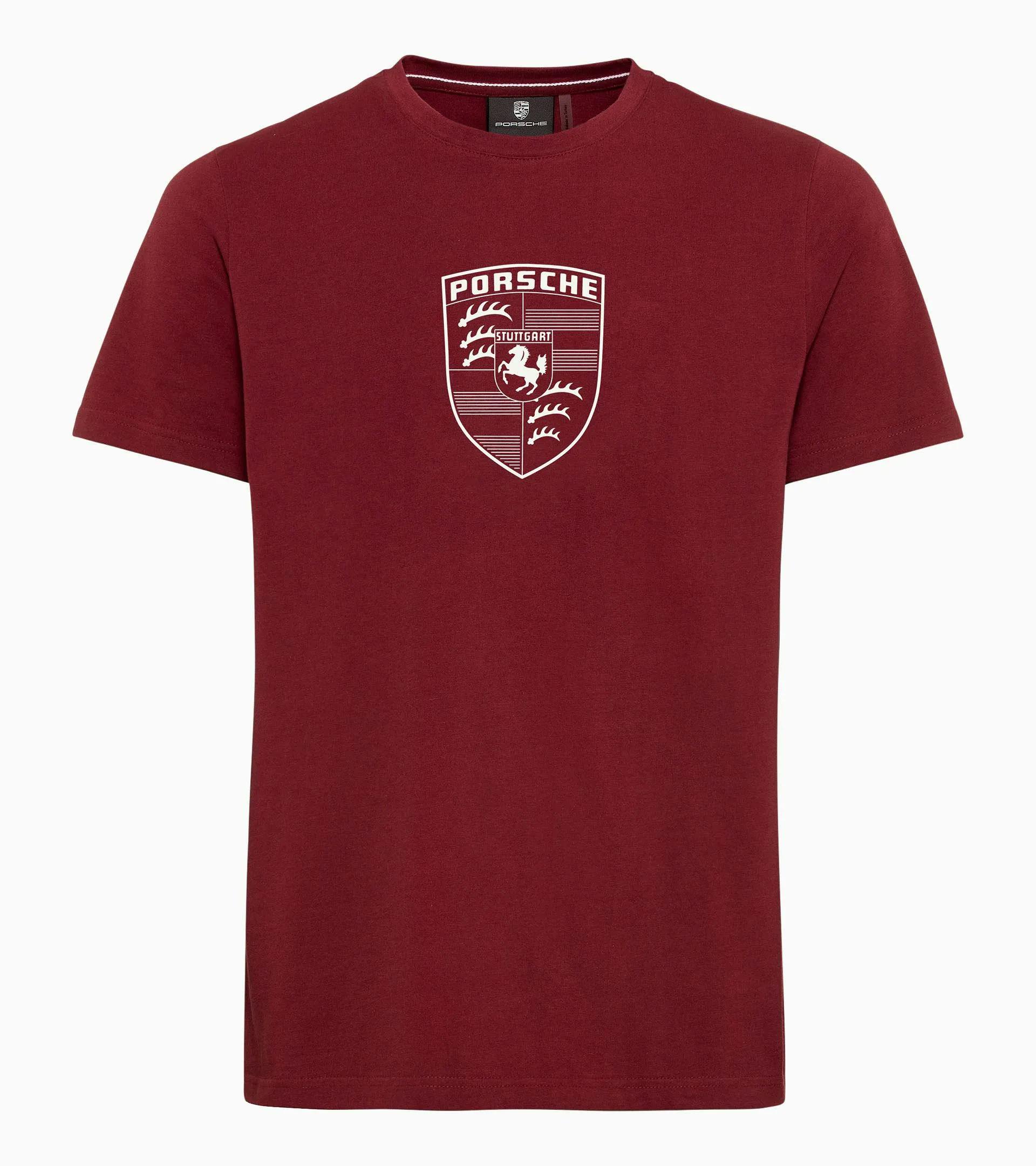 Hochwertiges Porsche T-Shirt mit Crew Neck. Veredelt mit einem Print des historischen Porsche-Wappens vorne und einem Porsche-Silikon-Print hinten. Story Label am Saum.