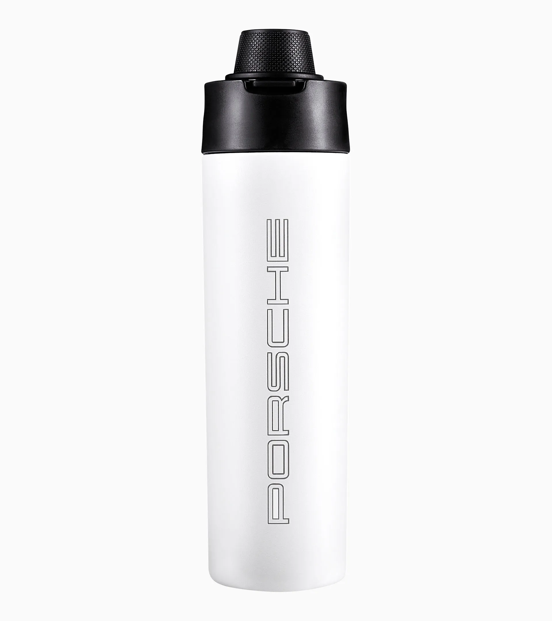 High Performance to go: Die doppelwandige Porsche Thermotrinkflasche mit Tragegriff hält heiße Getränke warm und kalte Getränke kühl – und das absolut auslaufsicher. Die weiße Pulverbeschichtung und der gelaserte „PORSCHE“-Schriftzug verleihen ihr einen cleanen, zeitlosen Look. Das Design des Deckelverschlusses ist an den Drive Mode-Knopf des Porsche-Lenkrads angelehnt.