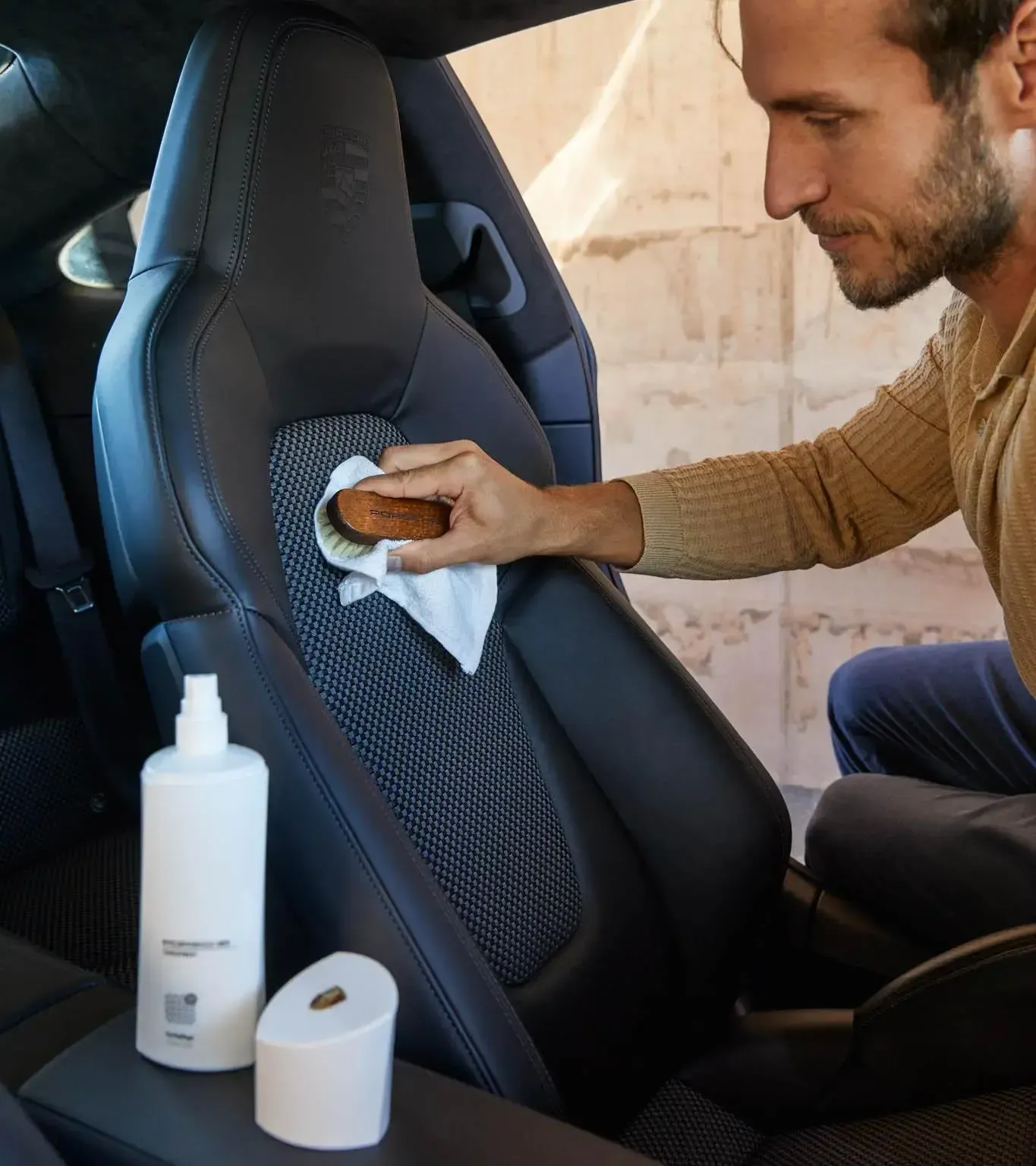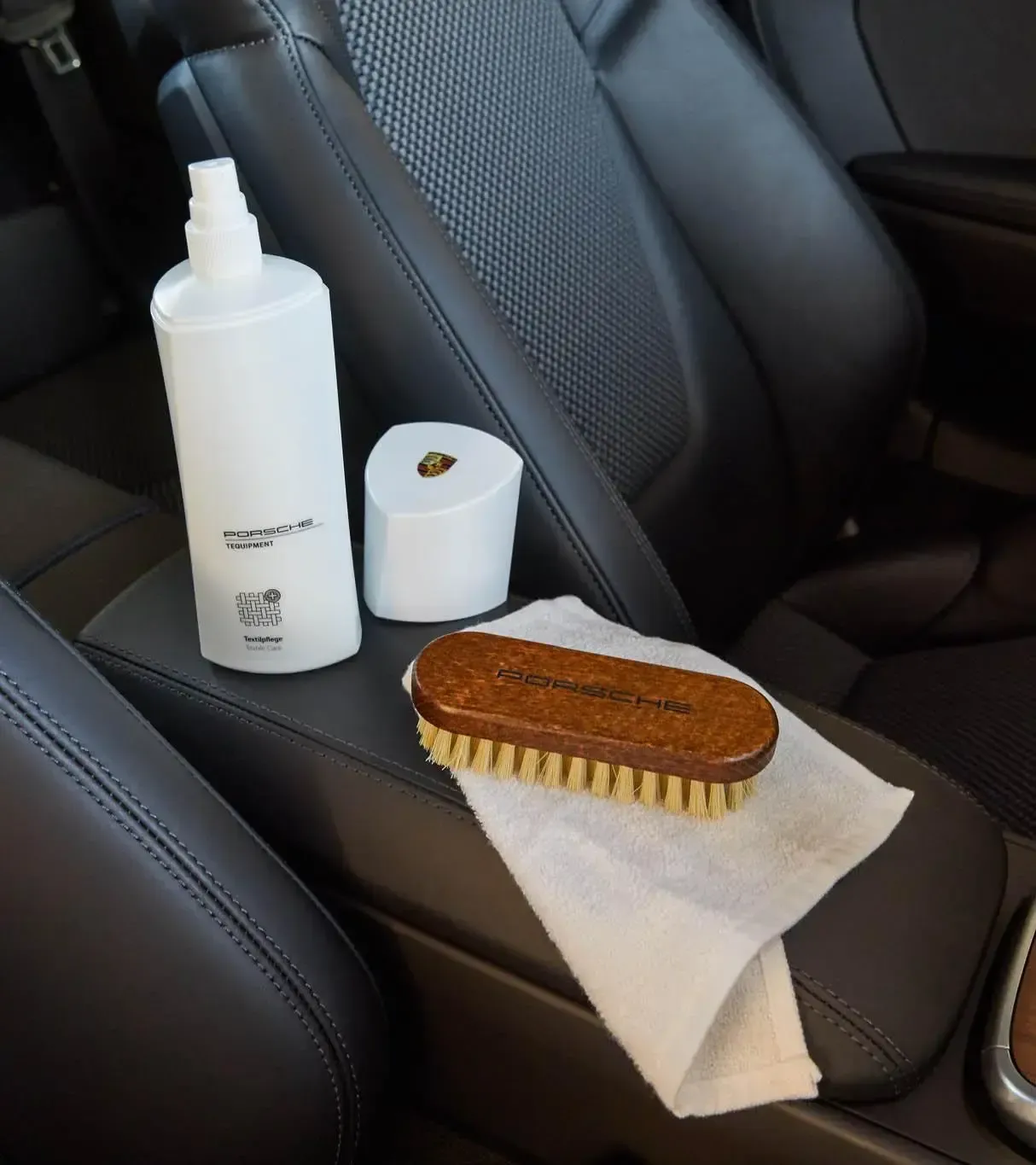 The Porsche textile care set includes everything required for thorough cleaning and care. It powerfully removes even stubborn and ingrained dirt. This is achieved in a gentle and effective manner. The Porsche care set is suitable for nearly all textiles in the vehicle (e.g. Alcantara®, Race-Tex and corduroy). It returns even heavily used surfaces to their pristine appearance.