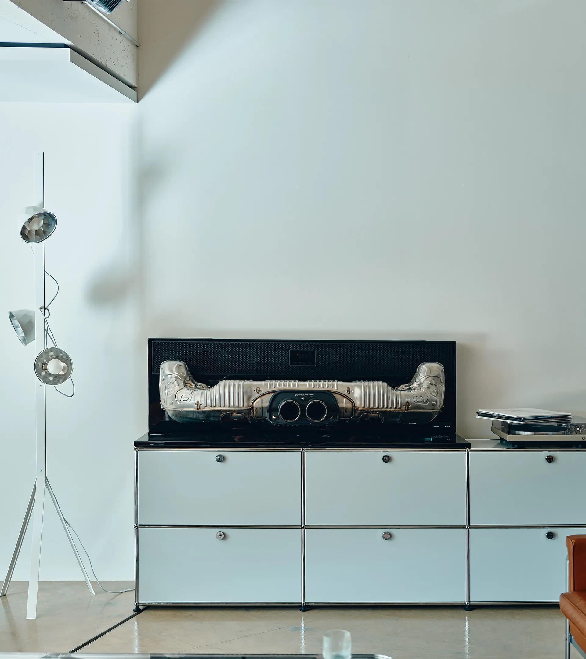 From 0 to goosebumps – in a single sound curve. The strictly limited-edition (500 pieces) 911 Soundbar 2.0 Pro, made from the original Porsche 992 GT3 (992) exhaust system. The 2.1.2 Virtual Surround Sound System features 300 watts of system power, 4K compatible HDMI ports, Bluetooth 5.0, Dolby Atmos DTS-HD, streaming with Apple AirPlay 2 and Google® Chromecast built-in for multiroom. The Soundbar is equipped with in-room multi-channel streaming technology that connects with the 911 Soundbar Special Edition, the 911 Soundbar Final Edition as well as future new Porsche Originals sound products. It can be hung on the wall or placed on the base provided. Made in Germany.
