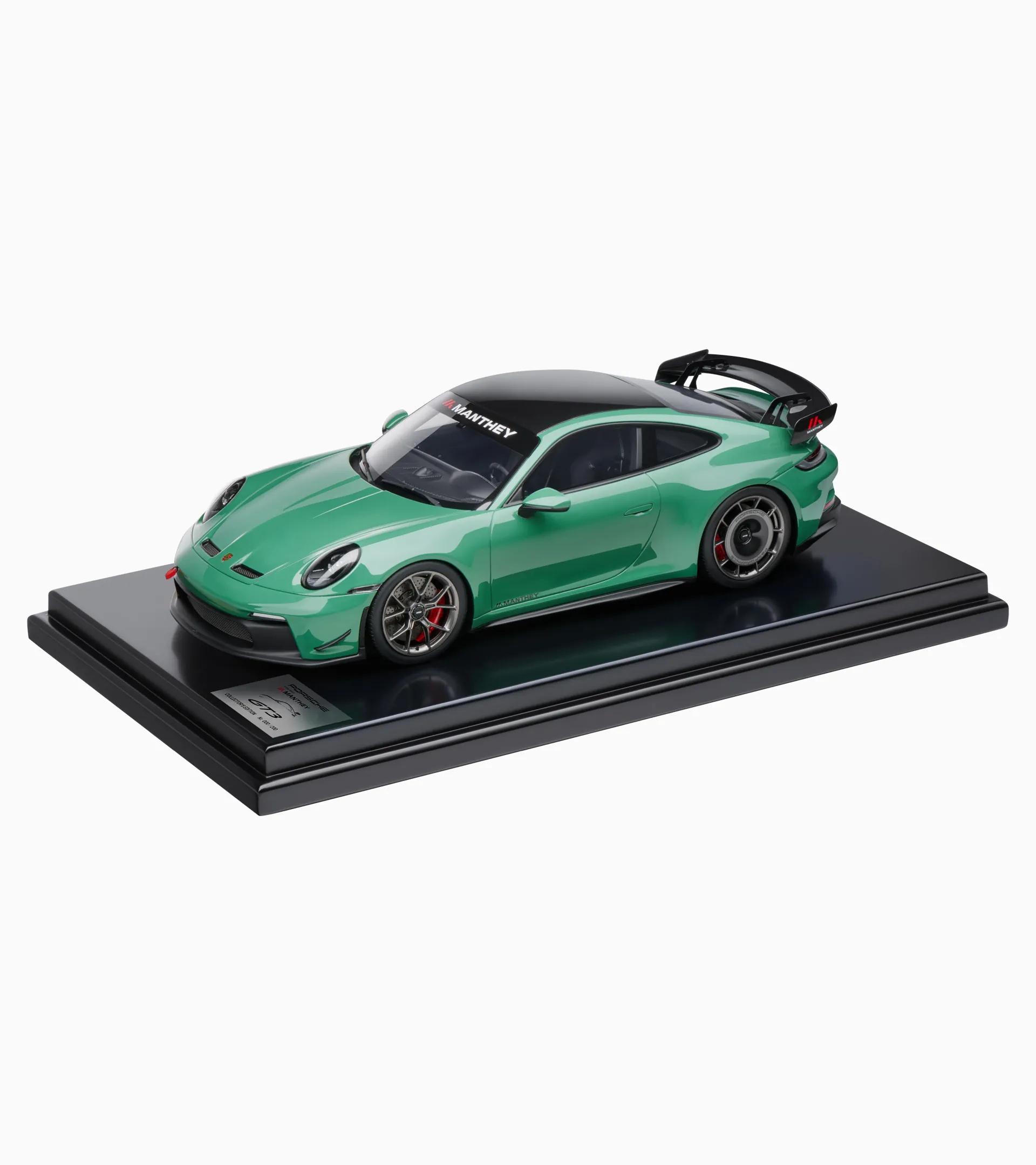 The exclusive 1:12 scale model of the Porsche 911 GT3 992 with Manthey Kit showcases impressive attention to detail and deserves its place in any collection. Made of resin. Auratiumgreen exterior, Black interior. Limited to 200 units.