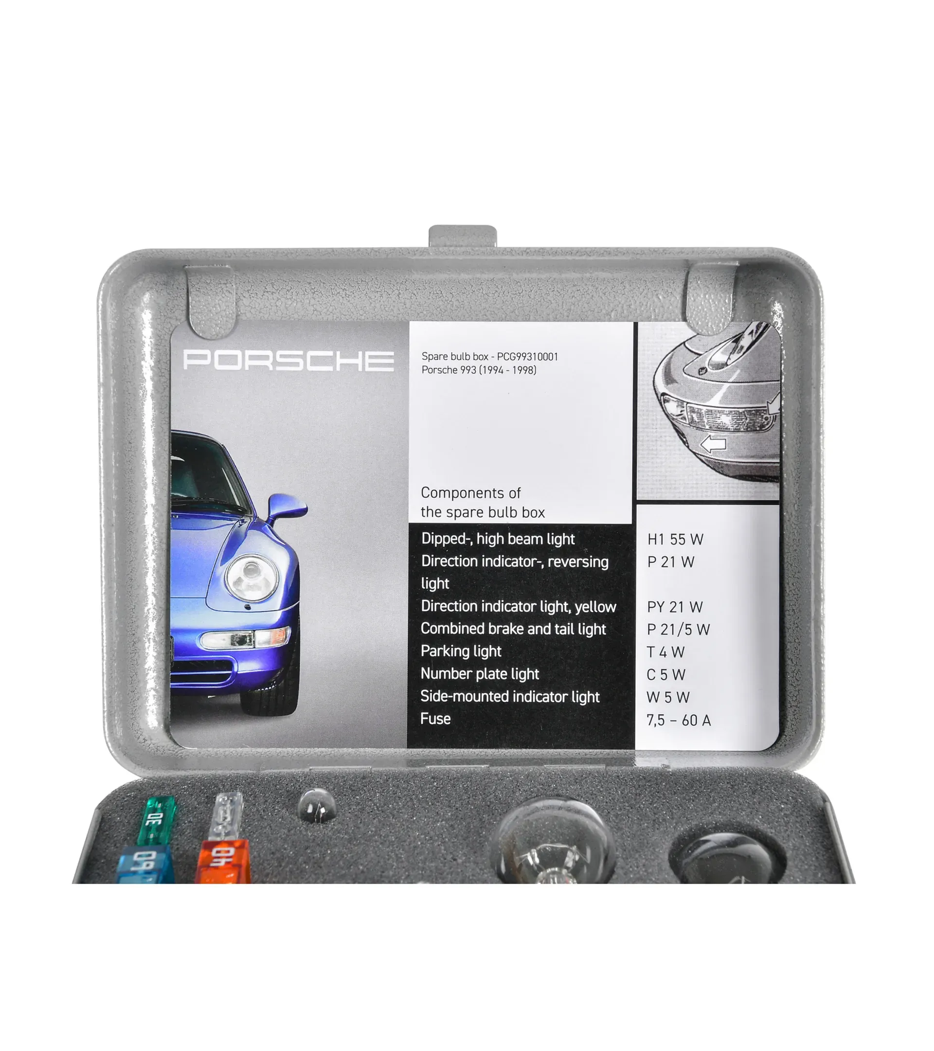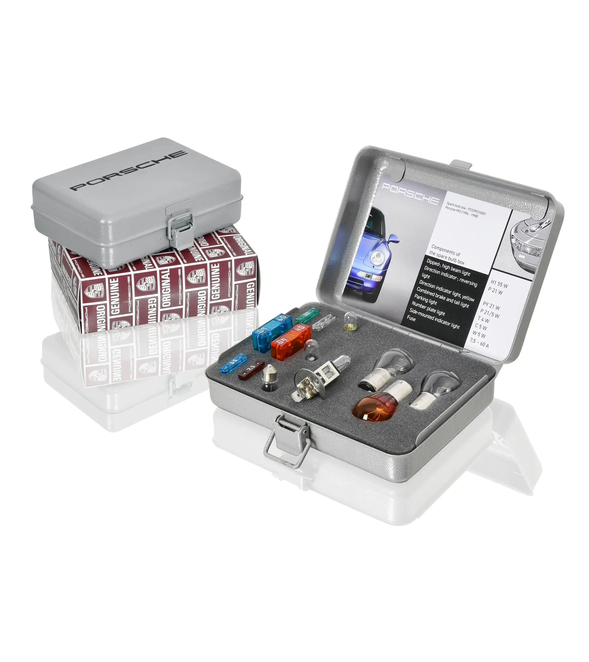 The bulbs and fuses are stored in a metal box in historic Porsche Silver, with raised Porsche logo in Black and a foam insert inside.