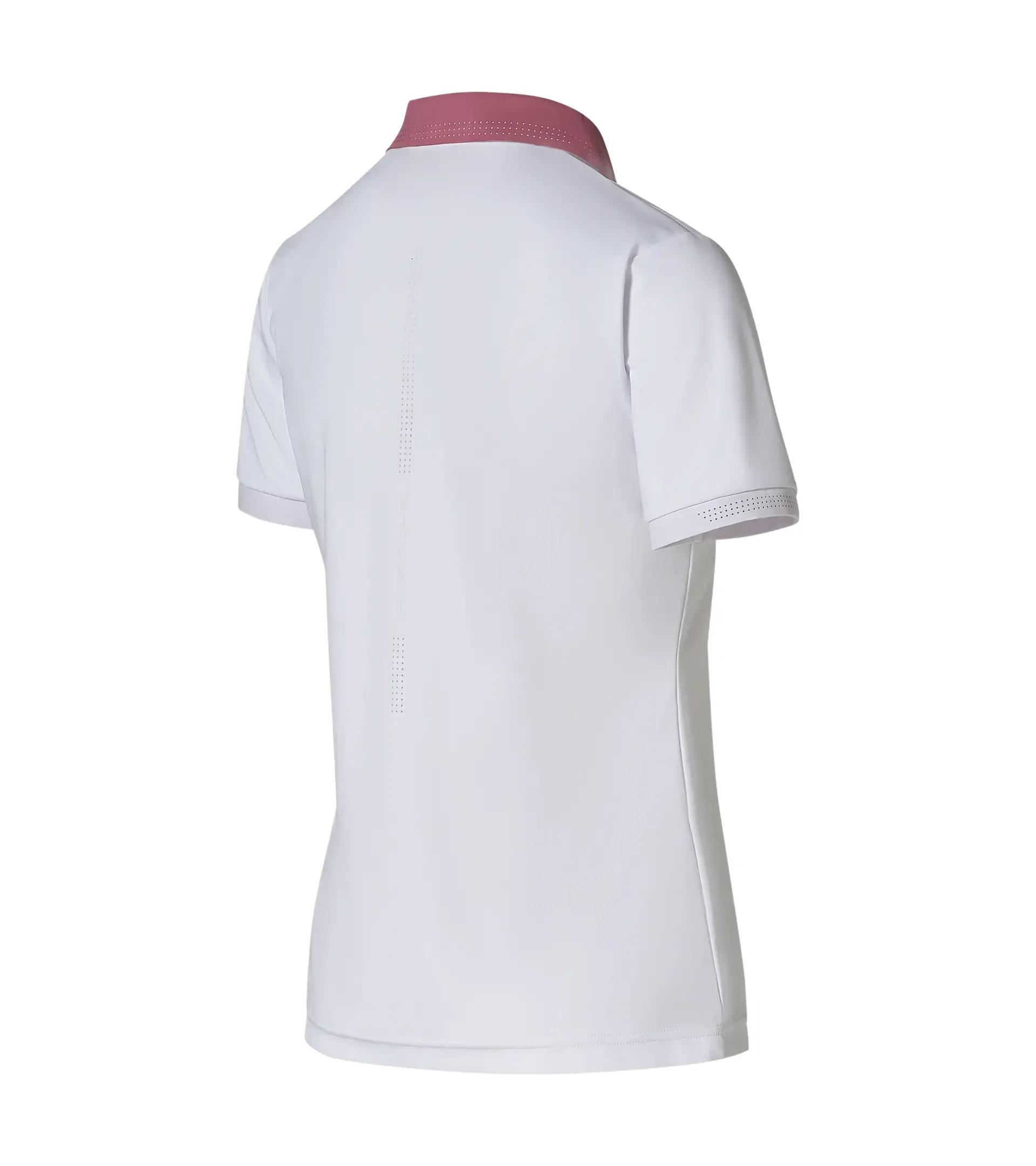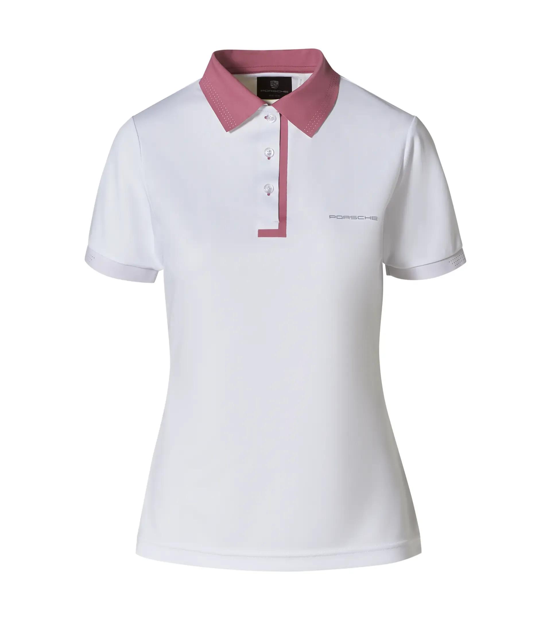 Feminine short-sleeve polo shirt with sleeves made of functional piqué jersey, decorative perforation and "PORSCHE" logo.