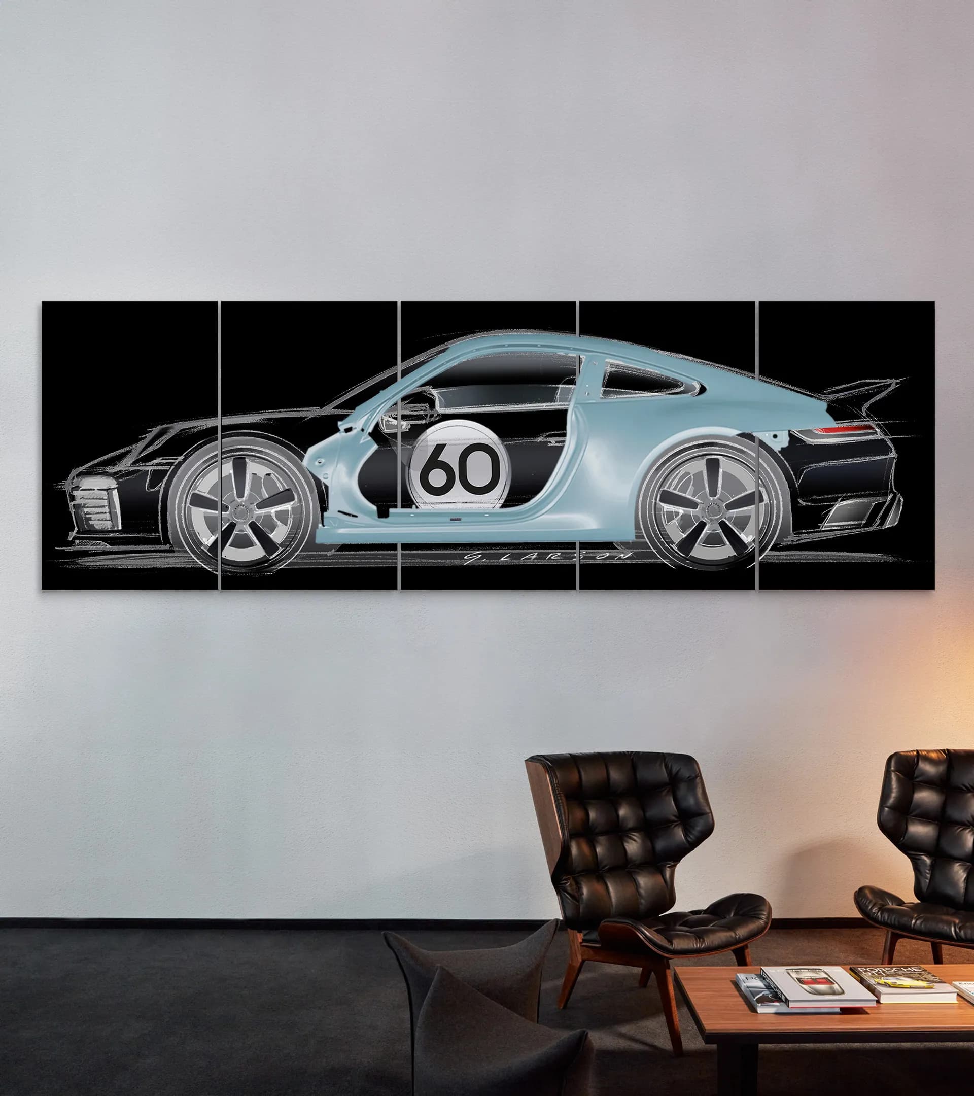 La passion Porsche, chez soi : installation murale personnalisable, en édition limitée, composée d’une pièce de carrosserie originale de la 911 Sport Classic [992], avec sur le panneau arrière un croquis de design signé Grant Larson. Panneau latéral en aluminium, peint dans une couleur au choix parmi 3 teintes de carrosserie Porsche. Panneau arrière en aluminium 5 pièces, Noir ou Blanc, encadré d’aluminium anodisé couleur Argent. Édition limitée à 60 exemplaires dans le monde.
