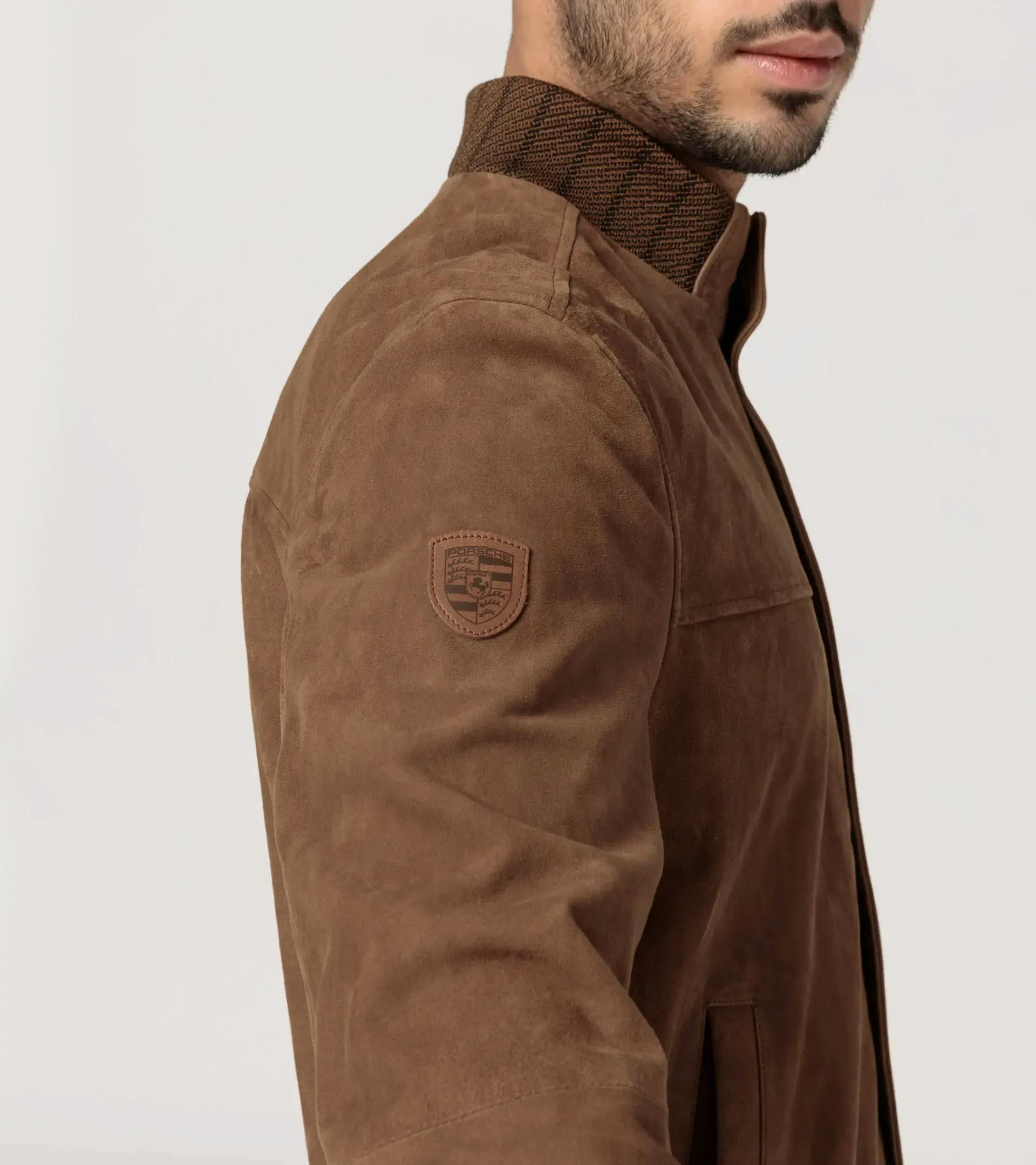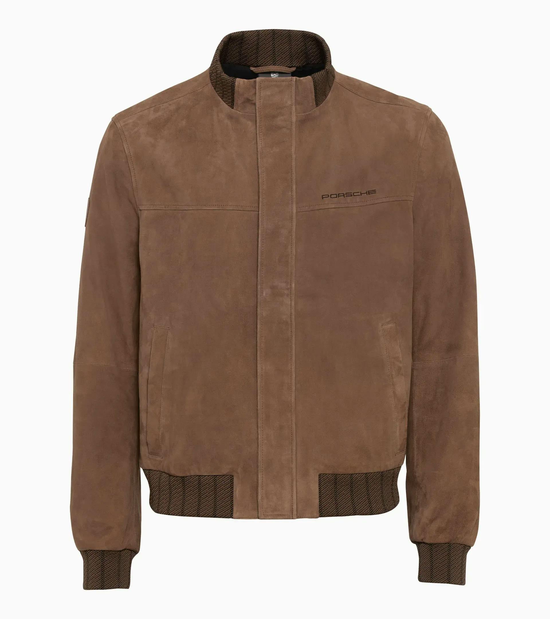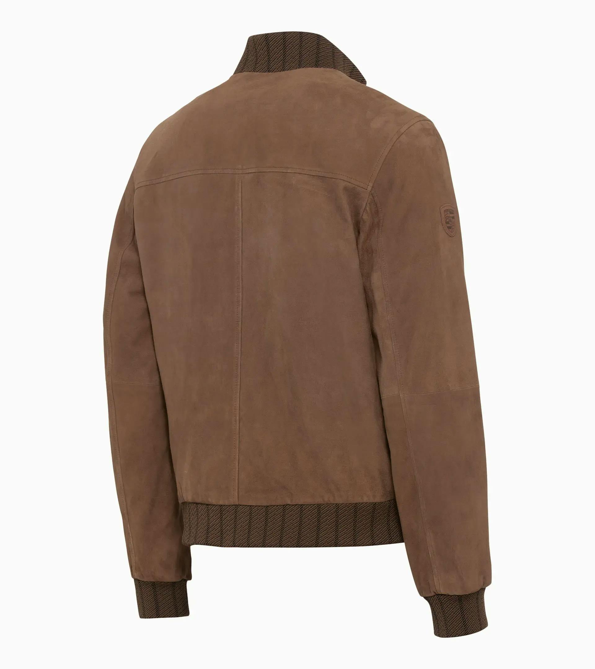 Veste en cuir exclusive Porsche en chevreau velours, avec empiècements en maille tricot.