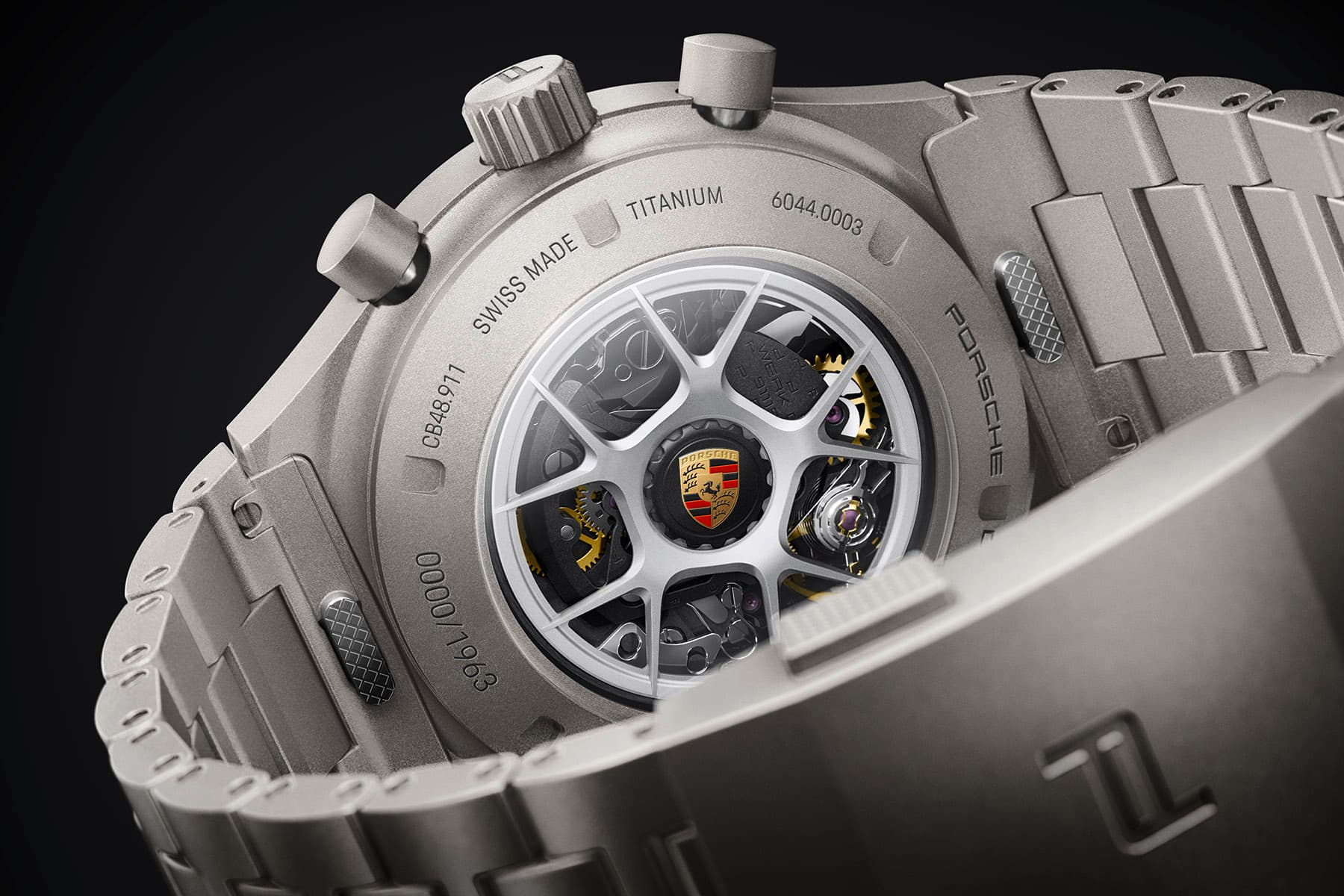 Protégé derrière un verre saphir antireflet sept couches transparent, le mouvement est entraîné par un rotor évoquant la jante en magnésium, à choisir parmi les couleurs Argent brillant, Argent foncé (finition satinée) ou Noir (finition satinée). Celui du Chronographe 1 – 911 S/T Heritage se décline quant à lui dans les couleurs Ceramica (finition satinée) et Argent brillant. Au centre de toute l’attention : le cache central du rotor portant l’impression graphique S/T en Argent brillant pour le Chronographe 1 – 911 S/T ou l’écusson Porsche historique pour la version Heritage. Pour marquer qu’il s’agit indéniablement de votre véhicule et de votre Chronographe, vous trouverez votre numéro de série limitée sous la forme d’une gravure laser sur le fond en titane au dos du boîtier.