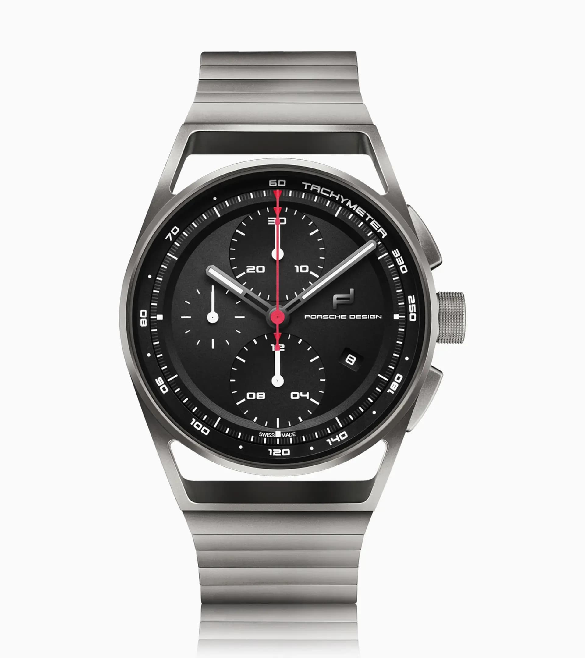 Dalla passione per gli sport motoristici e la pura performance. Con l'introduzione del modello "1919 Chronotimer", Porsche Design crea una connessione estetica tra il design architettonico, l'amore per lo sport e la performance. strong Cassa: Diametro: 42 mm Altezza: 14,90 mm Materiale: titanio Corona: avvitata Vetro: convesso, antigraffio, vetro di zaffiro sottoposto a sette trattamenti antiriflesso su entrambi i lati Parte inferiore della cassa: avvitata Impermeabile: fino a 10 bar QUADRANTE: Minuti, ore, piccoli secondi alle ore 9, secondi cronografati, contatore dei 30 minuti alle ore 12, contatore delle 12 ore alle ore 6, finestra con la data alle ore 3, scala tachimetrica Cinturino: Gomma nera con profilo LaserFlex Fibbia pieghevole MECCANISMO: Calibro: Sellita SW500 Rotore: Porsche Design Icon Rotor Diametro: 30 mm Altezza: 7,9 mm Riserva di carica: 48 ore Alternanze: 28. 800 per ora (4 Hz) Pietre: 25.