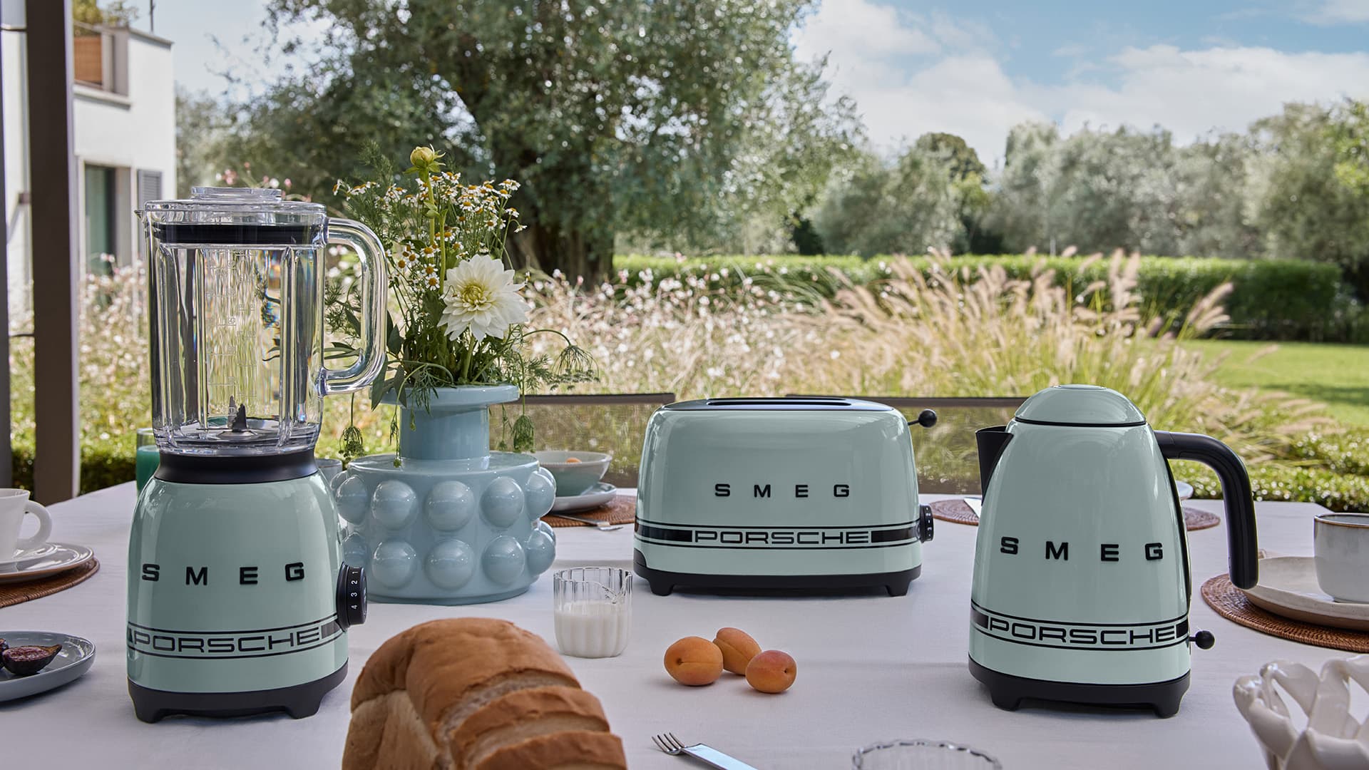 Un elettrodomestico da cucina dal carattere deciso: chiaro nella forma, preciso nella funzione. L'iconico look anni '50 di Smeg si fonde con il linguaggio di design purista di Porsche: accenti neri opachi su manico, fondo e beccuccio, oltre alla caratteristica striscia Porsche sul corpo.