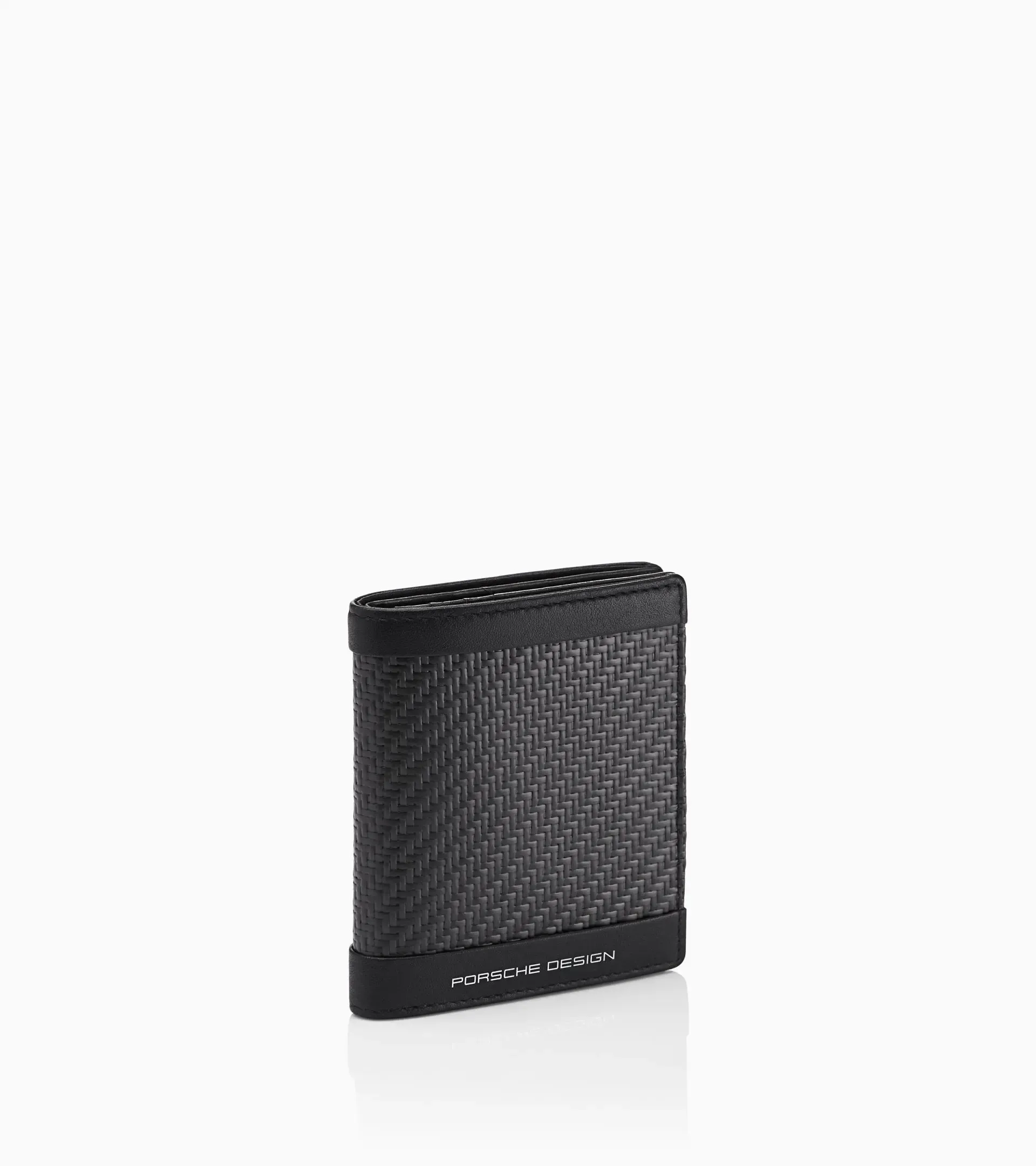 Portafoglio piccolo da uomo in fibra di carbonio Porsche Design e pelle. È dotato di portamonete, scomparto per banconote, 6 slot per carte di credito e 2 tasche.