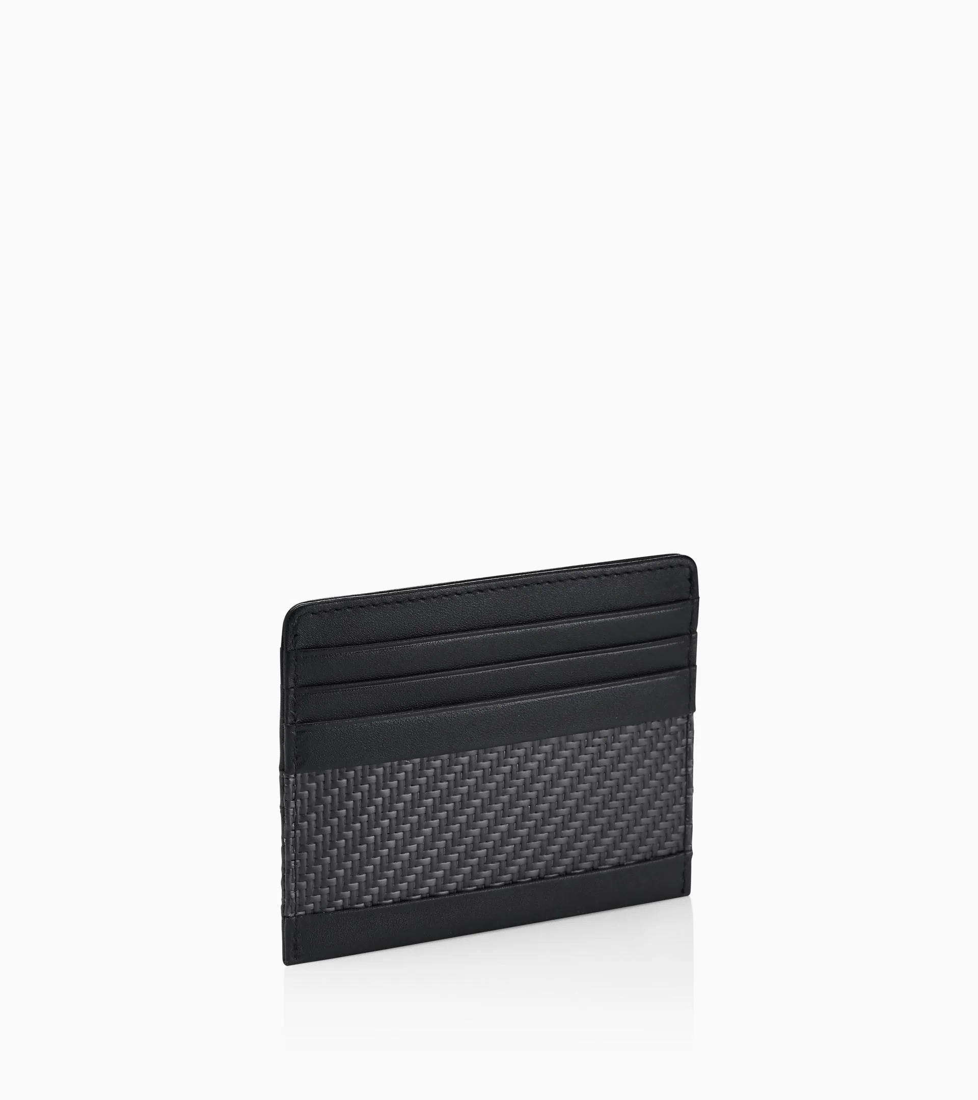 Il design con sei slot per carte di credito, di cui tre sul davanti e tre sul retro, e uno scomparto superiore intermedio offre spazio per tutte le carte importanti, i biglietti da visita e le banconote. Dettagli realizzati in esclusiva nappa nera ne accentuano la struttura tecnica, sottolineando il carattere inconfondibile di questo portatessere