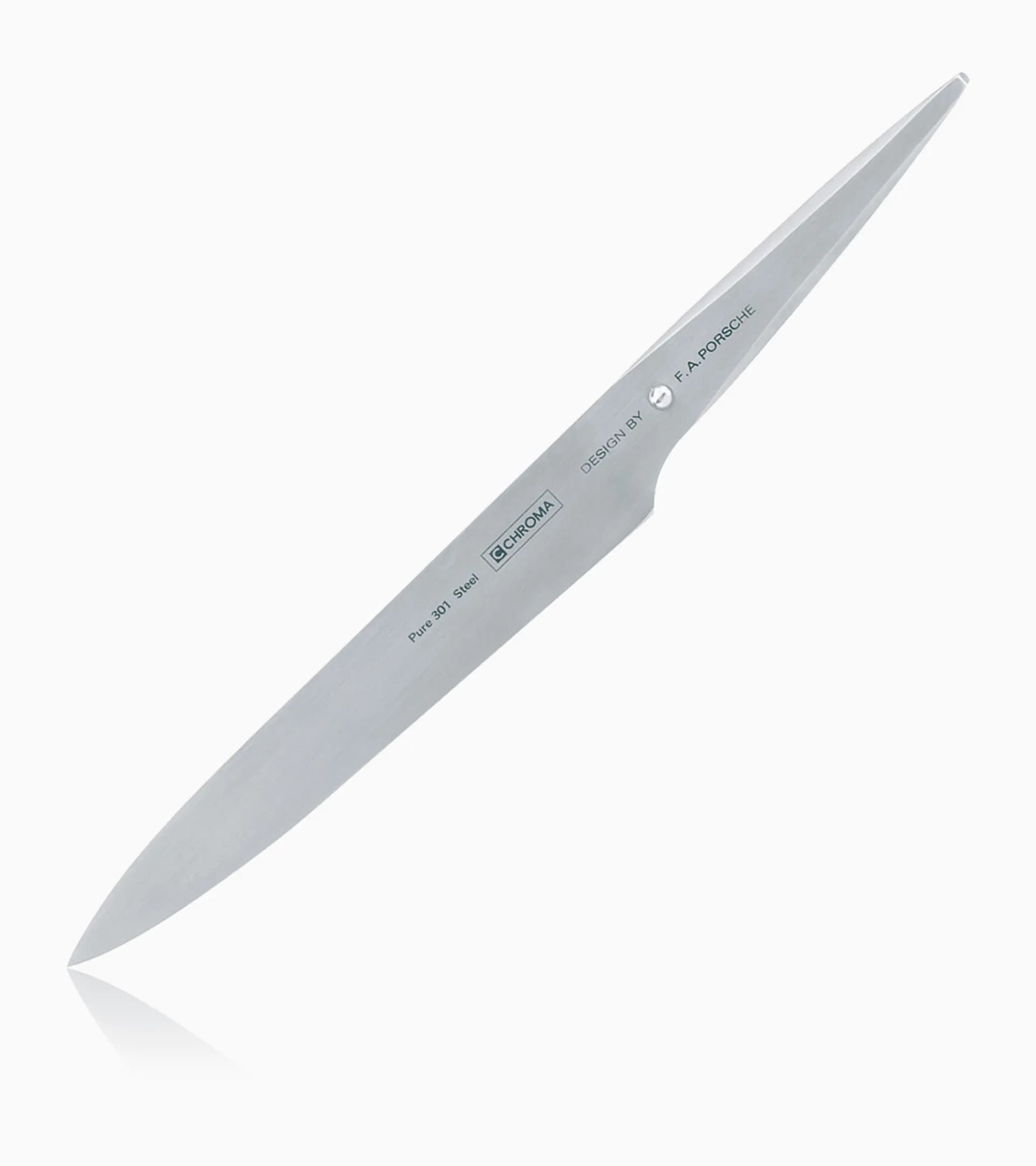 Questo coltello trinciante di Porsche Design è più di un semplice attrezzo: è un emblema di design eccezionale e maestria professionale nella tua cucina. Sviluppato appositamente per trinciare arrosti e pollame, il coltello convince per l'eccellente qualità di taglio e l'ergonomia eccezionale.Manico e lama si fondono perfettamente garantendo una maneggevolezza armoniosa e fluida. Il tallone pronunciato in acciaio inossidabile segna con discrezione il passaggio tra lama e manico, fungendo al contempo da appoggio ideale per il pollice e l'indice. Il manico dal design ergonomico è volutamente ispirato ai metodi di lavoro degli chef professionisti, che utilizzano i coltelli con angoli di taglio variabili. Le speciali tacche sul manico rendono il coltello comodo e flessibile da maneggiare e consentono di variare la posizione di presa.Realizzata in acciaio giapponese Pure 301 di alta qualità, la lama garantisce longevità e un'affilatura eccezionale in grado di soddisfare anche le esigenze più elevate. Design by Studio F. A. Porsche.