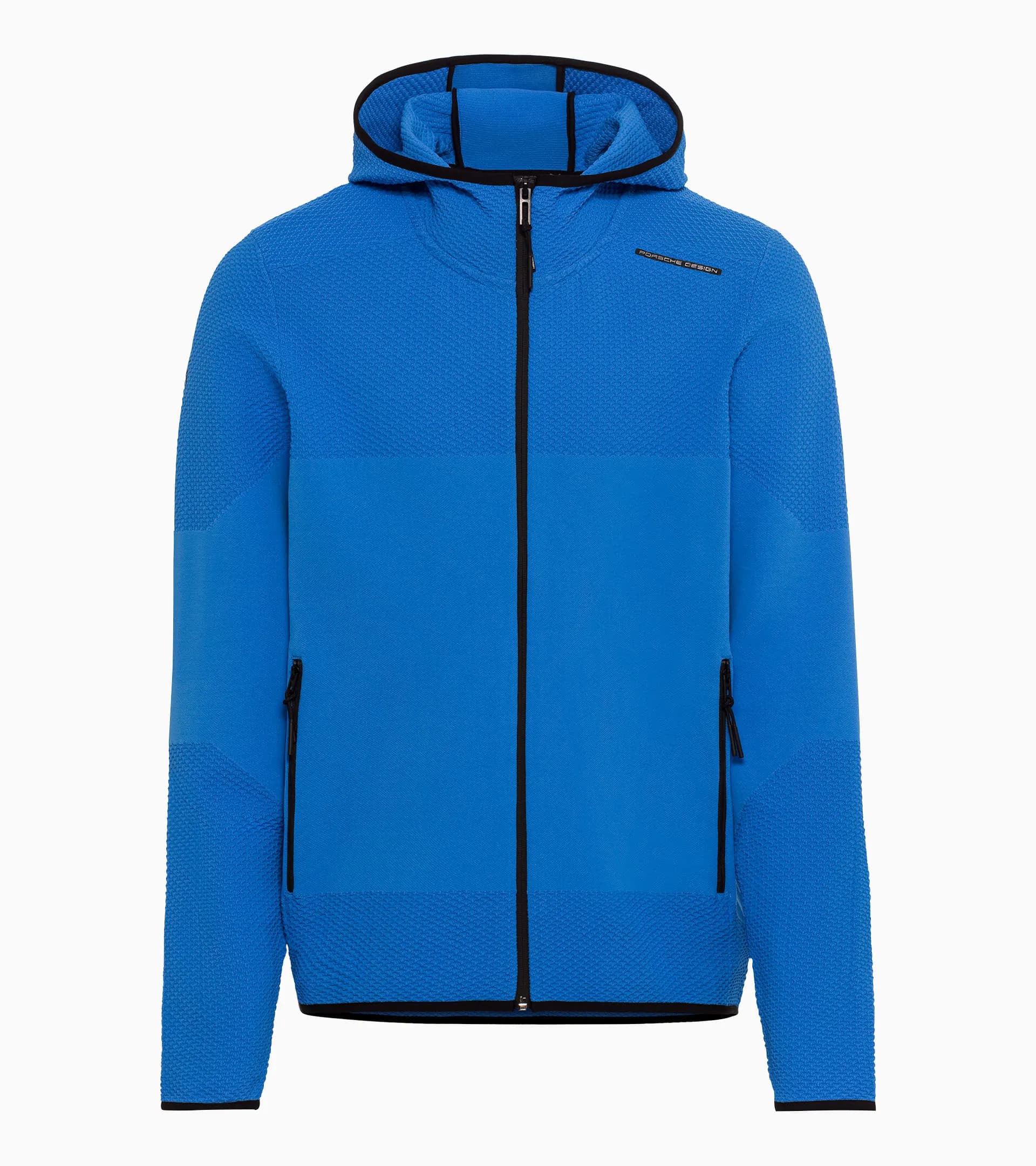 La giacca midlayer EvoKNIT® combina funzionalità sportiva e design esclusivo. Con la maglia 3D grafica, ispirata alla struttura esagonale della GT3 Touring, il colletto rialzato nel cappuccio e la struttura senza cuciture sul corpo, già esteticamente questa giacca è sinonimo di massime prestazioni. Gli elastici sulle maniche, sull'orlo e sul cappuccio assicurano il massimo comfort e un'ottima libertà di movimento. La giacca ha due tasche sui fianchi con cerniera. I tirazip Porsche Design della cerniera frontale e delle tasche aggiungono un tocco particolare.