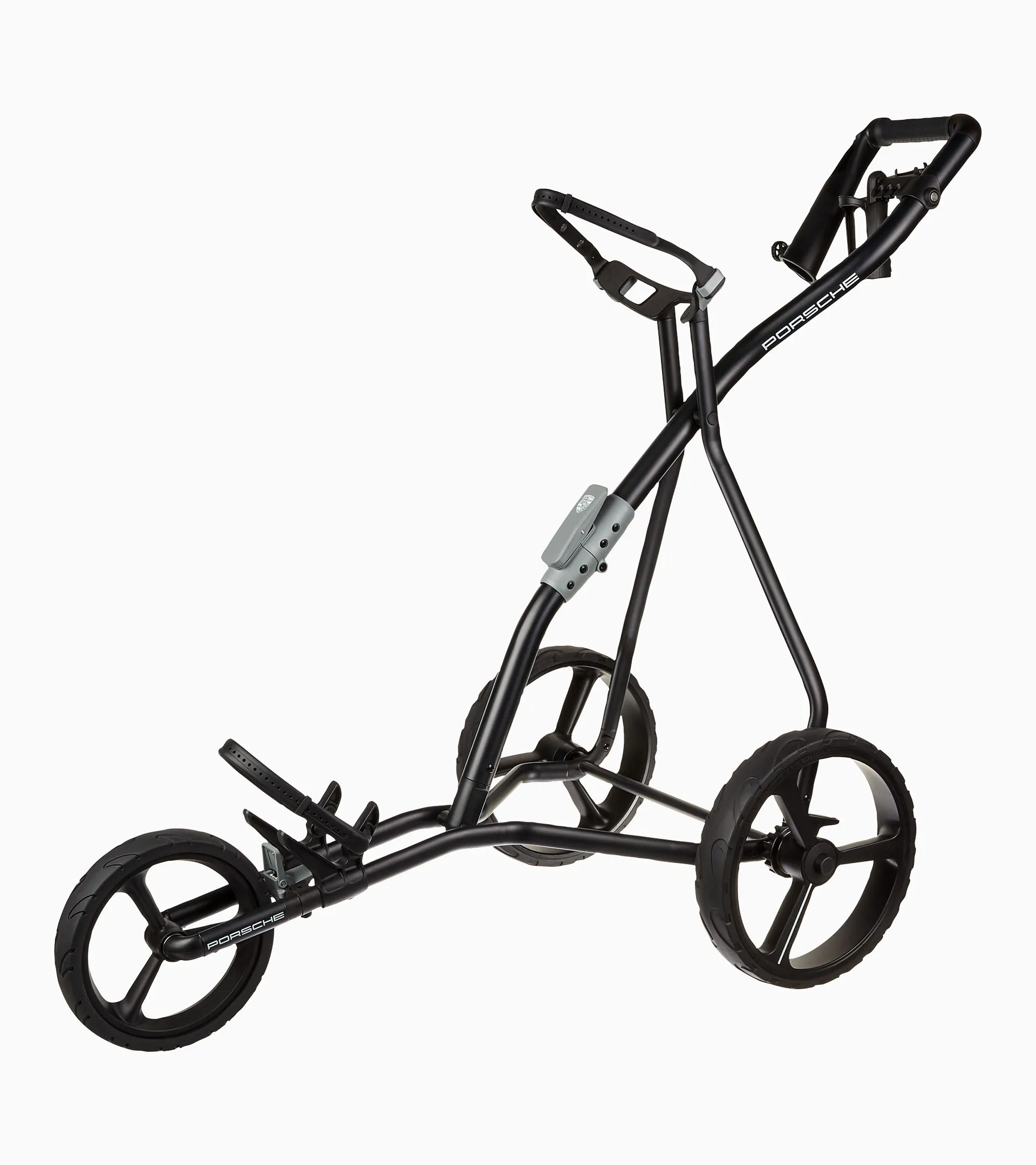 Questo Golf Trolley ultraleggero fa risparmiare spazio e tempo quando ci si reca al campo da golf: è completamente pieghevole e ha le ruote rimovibili, può essere riposto in un batter d'occhio nella borsa da trasporto in dotazione. Sul campo da golf permette di avere sempre tutti gli oggetti importanti a portata di mano, grazie ai pratici supporti per il segnapunti, il tè, le borracce e l'ombrello. Sul manubrio del trolley è stampata la scritta "PORSCHE", mentre sulla chiusura pieghevole è applicato lo stemma Porsche.
