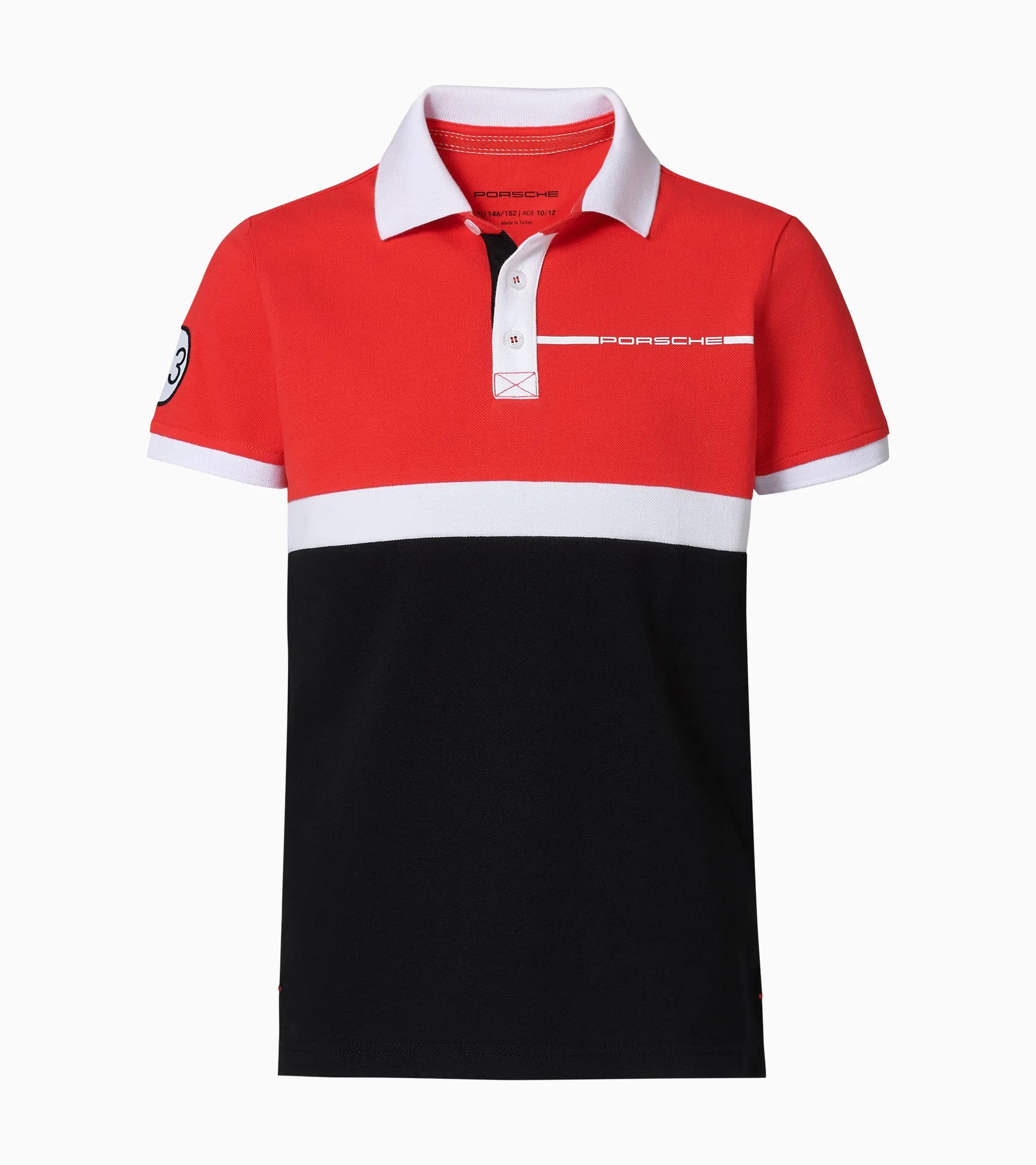 Polo maniche corte bambino con tre bottoni e stampa Porsche sul petto. Con stemma 23 sulla manica. Scritte Porsche e 917 stampate sulla schiena. Piqué.