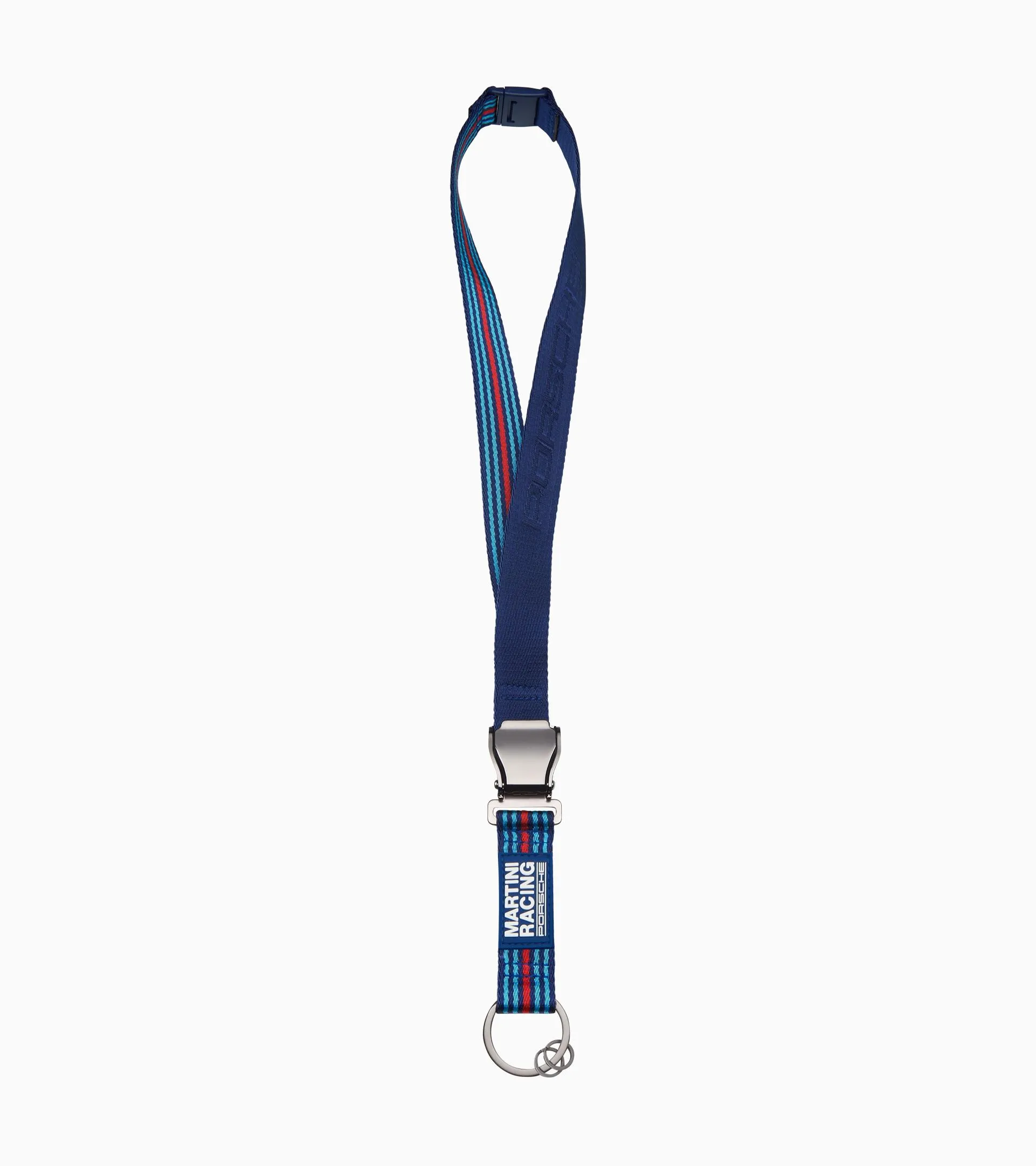 Portachiavi da collo con portachiavi estraibile e fibbia per aereo. Nei tipici colori MARTINI RACING®. Logo Porsche di tessuto. Distintivo in gomma «MARTINI RACING® PORSCHE». 1 portachiavi grande e portachiavi piccolo.