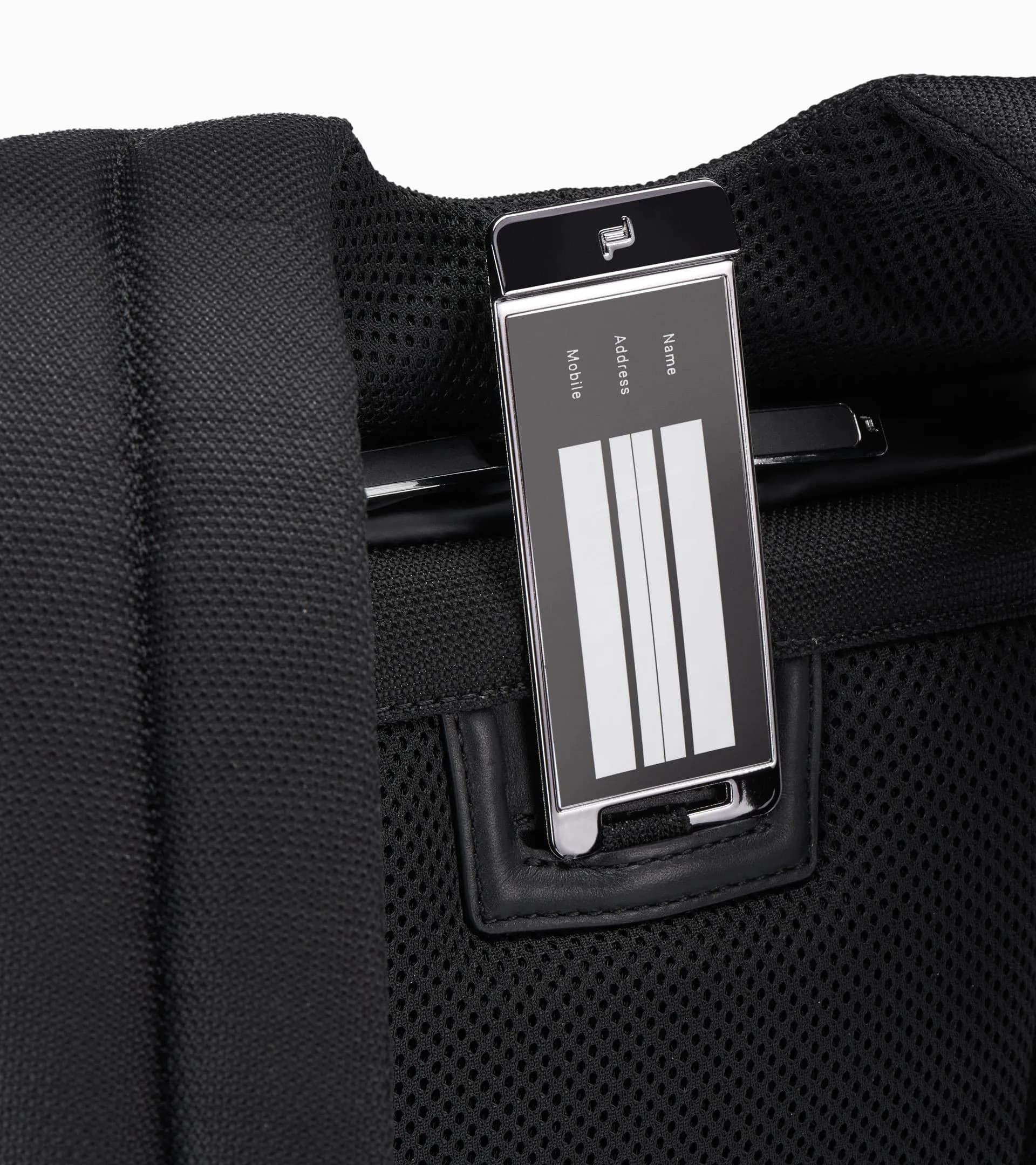 Zaino in stile business particolarmente sicuro realizzato in nylon tecnico ed esclusiva pelle liscia. Scomparto principale protetto con vano per notebook da 15 pollici. Attacco per trolley.