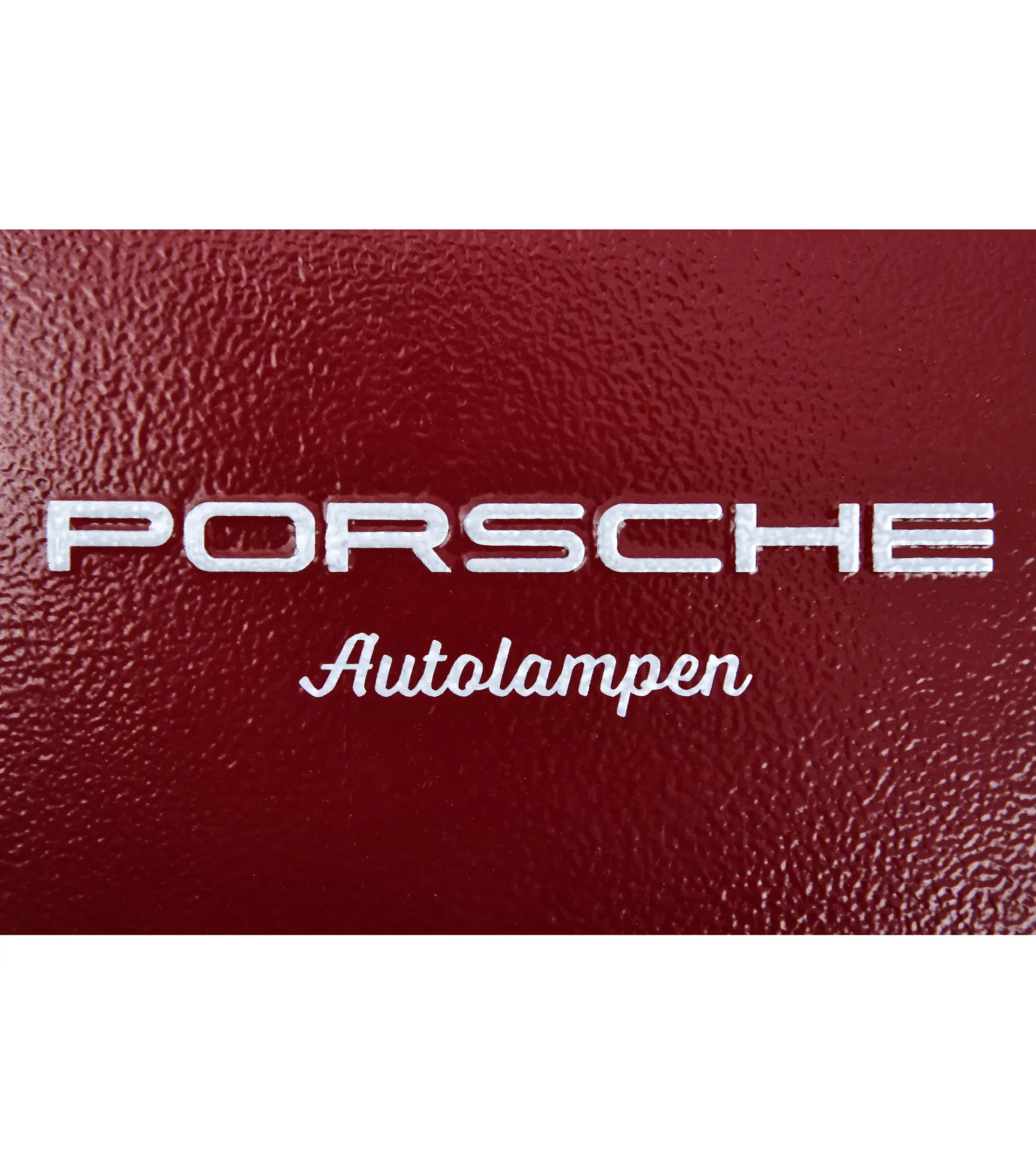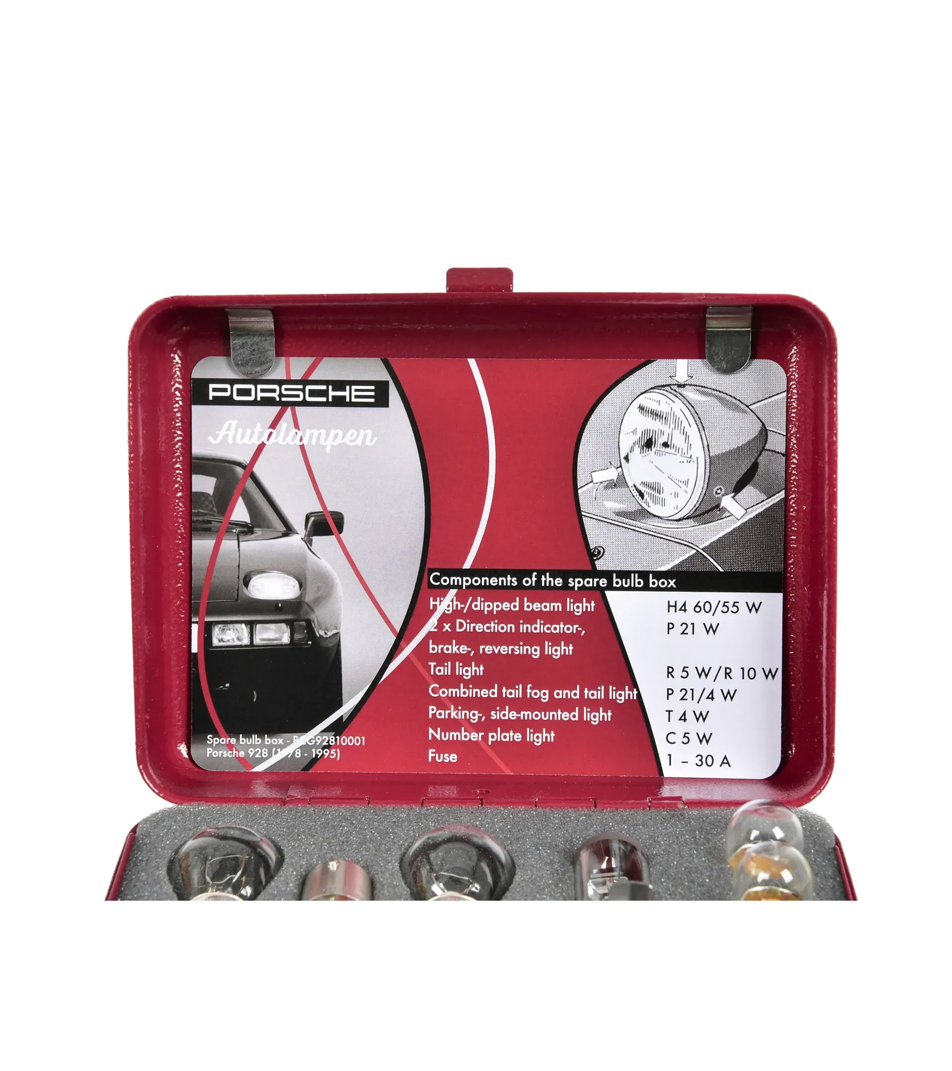 Le lampadine e i fusibili vengono forniti in una scatola di metallo nello storico colore rosso Porsche, con logo Porsche in rilievo in bianco e con un inserto in schiuma all'interno.