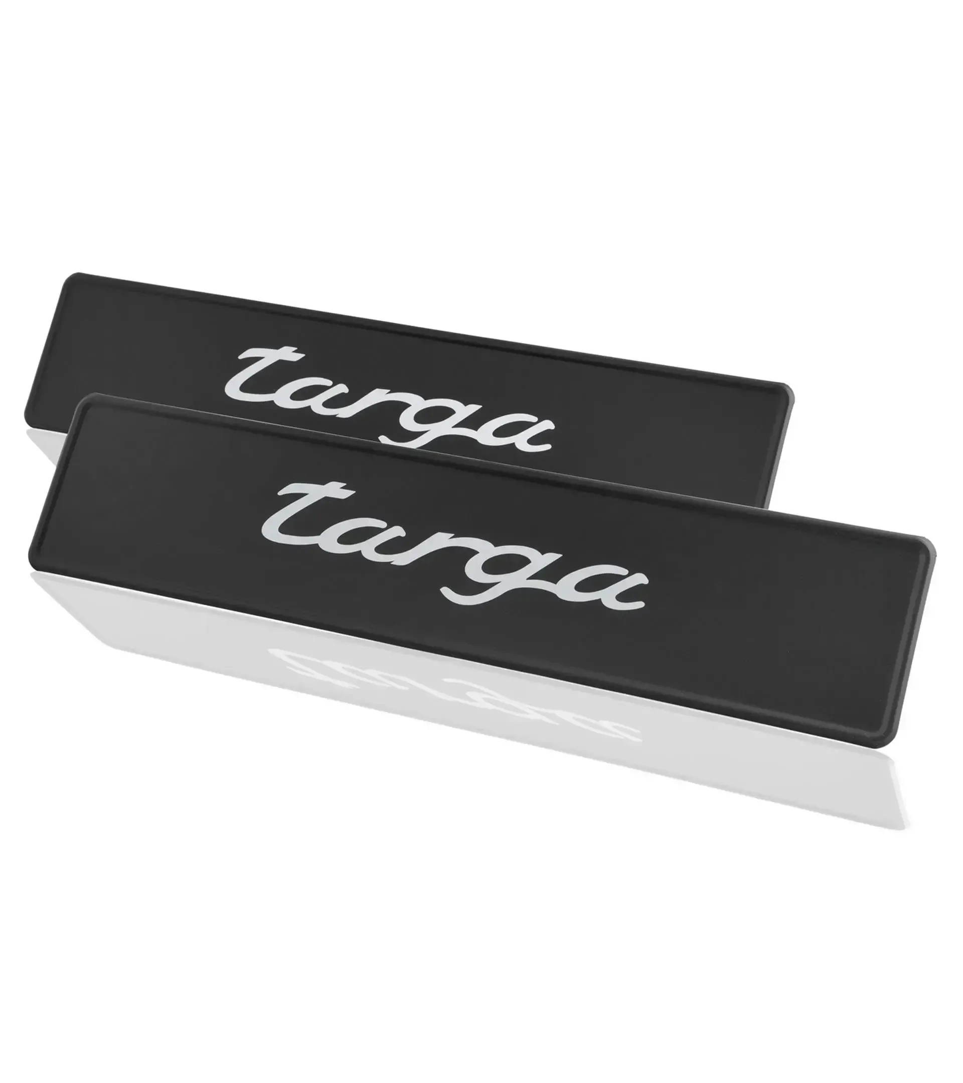 Targa nera con impronta bianca "targa" misura 11x52cm; utilizzabile per tutti i modelli Porsche Targa. Contenuto: 2 pezzi.