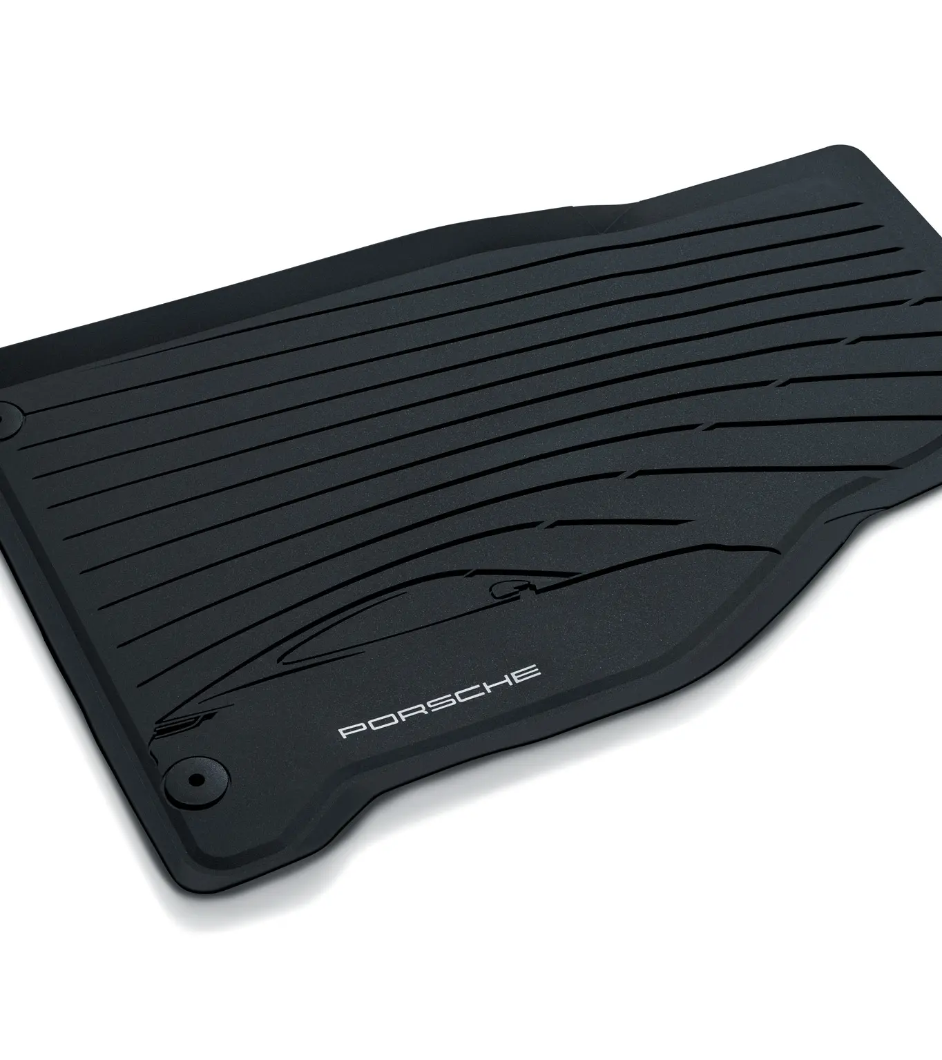 Two-piece set in attractive design with vehicle silhouette and "PORSCHE" logo. Non-slip and impermeable to water. With raised surrounding border.
