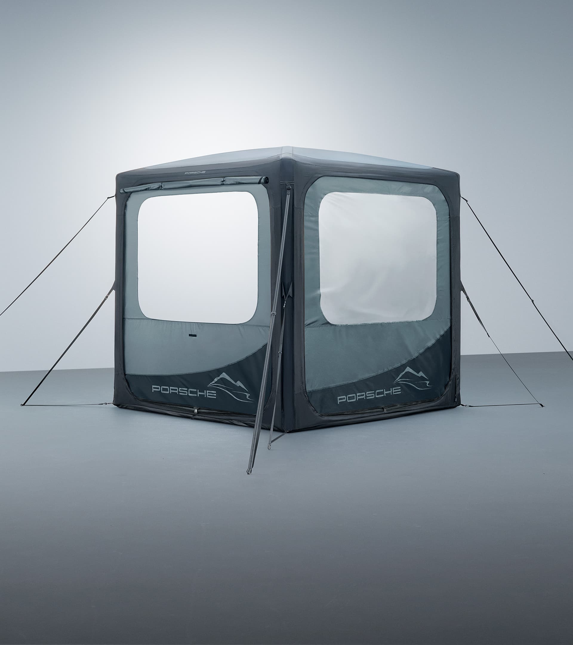 The mesh fabric provides ventilation and keeps even the smallest insects, such as mosquitoes or the like, at bay. It provides shade, and the matching canopy tent fabric privacy screen can be fully closed from the outside using side zips, offering protection from the wind and rain as well as privacy. When open, it can be secured in a rolled-up position using a loop clasp. And as time is sometimes of the essence, the wall element can also be installed quickly and conveniently with the easy zipper system. With the black and grey colour concept and a mountain silhouette as a graphic element, the pavilion matches the roof tent perfectly. In combination with the roof tent, the pavilion offers even more possible uses and always provides a stylish retreat.